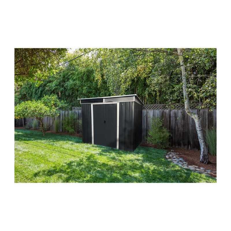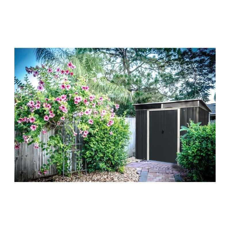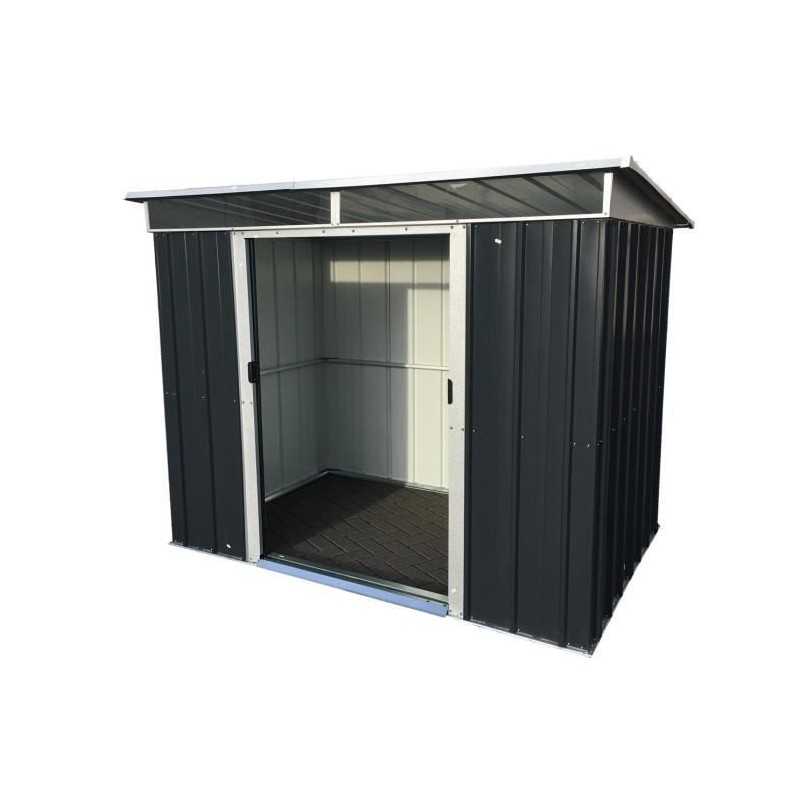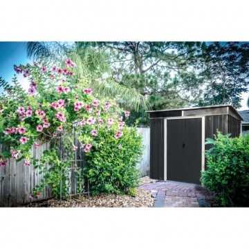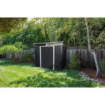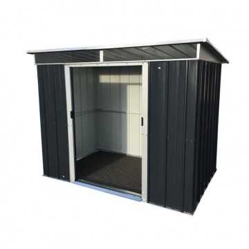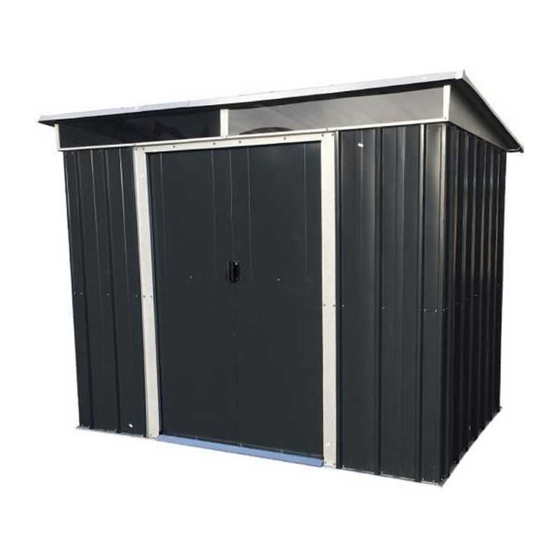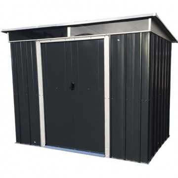 Abri de jardin métal 3,78m² surface hors tout - Anthracite et alu, surface utile 3,15m² - Surface ext.au sol 3,30m² - Structure galvanisée - 2 portes coulissantes intérieures - Lit d'ancrage fourni - Toit en pente - Ouverture en plexi sur le toit pour lumiere - Panneaux de toit translucide - 238 x 159 x 190 cm.