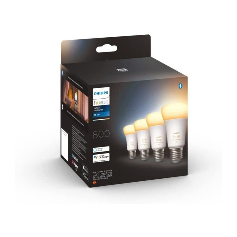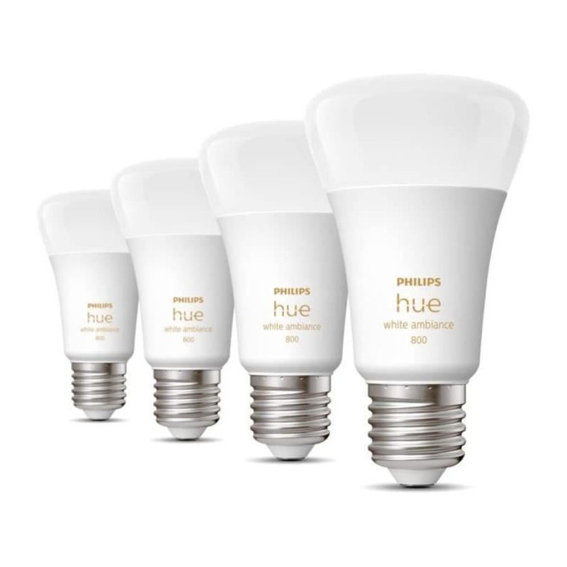 Philips Hue White Ambiance, ampoule LED connectée E27, équivalent 60W, 800 lumen, Pack de 4, compatible Bluetooth, fonctionne avec Alexa, Google Assistant et Apple Homekit