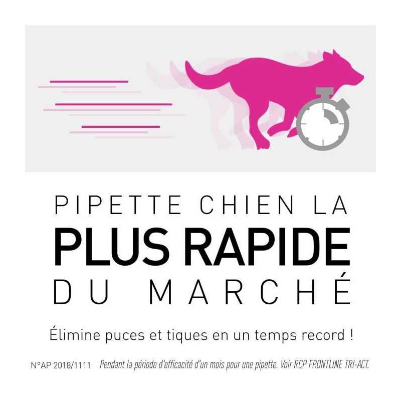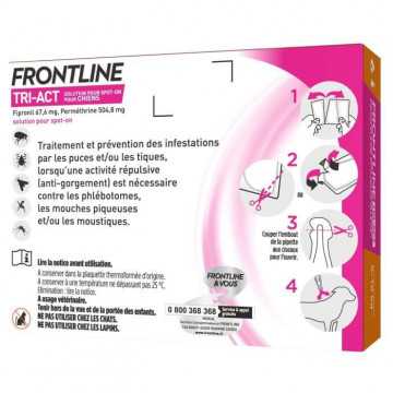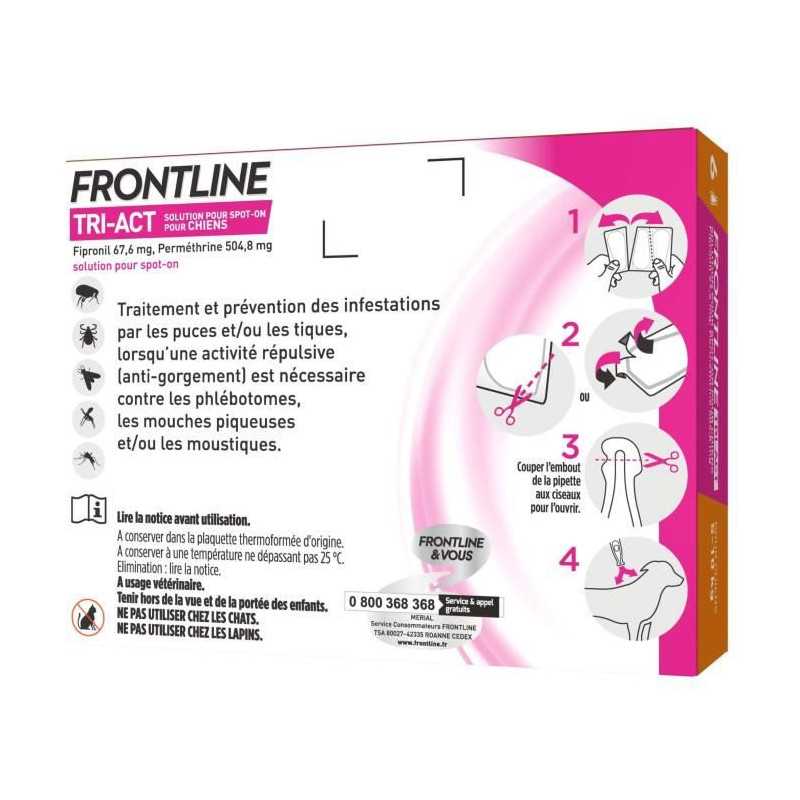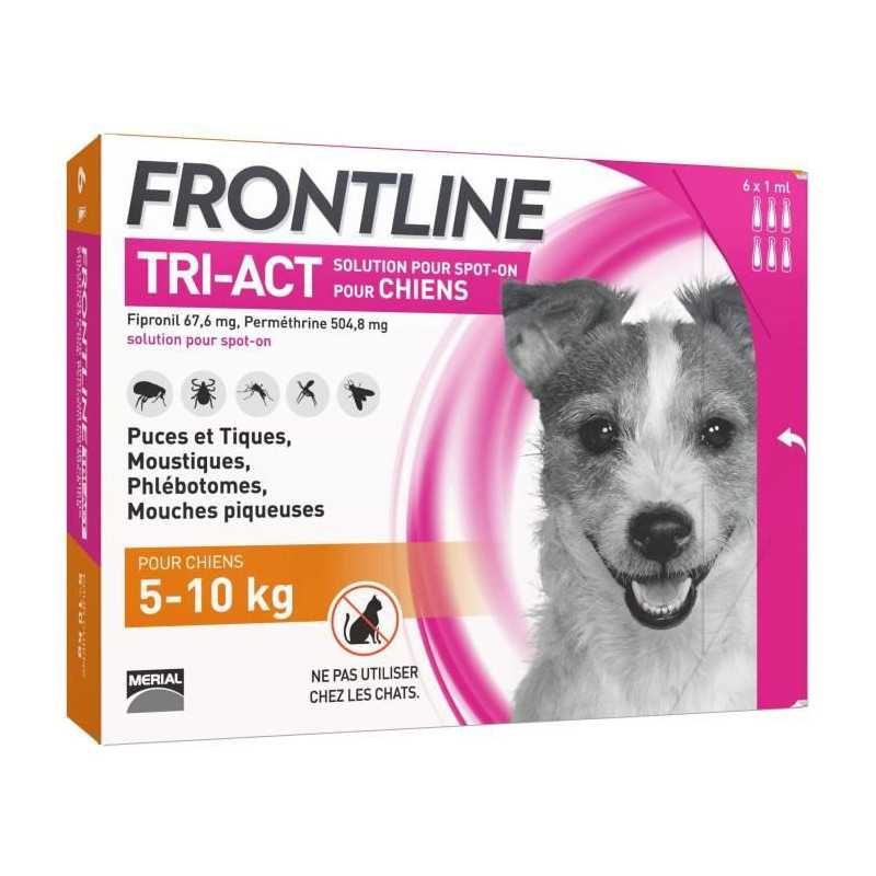 Frontline Tri-Act Chiens S 5-10 kg 6 Pipettes traitent et préviennent en un seul geste les infestations par puces et les tiques Elles ont une action répulsive contre les moustiques (dont les moustiques tigres), phlébotomes (vecteurs de la leishmaniose) et mouches piqueuses. Elles protegent votre habitat en tuant les puces avant meme qu'elles aient le temps d'y pondre.