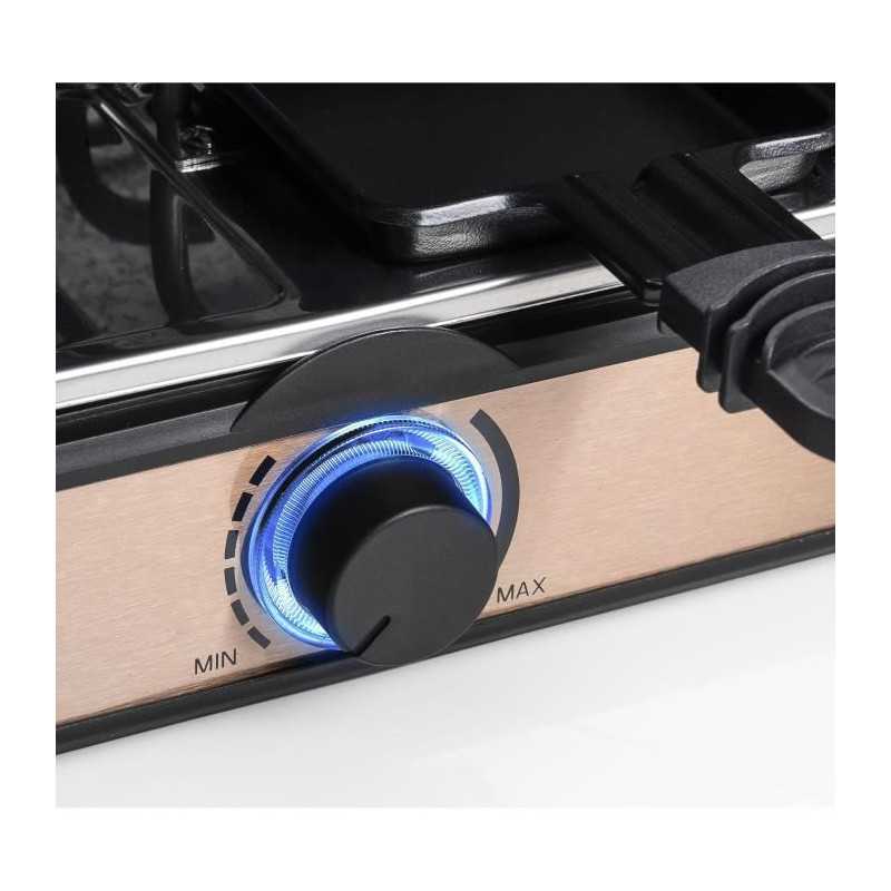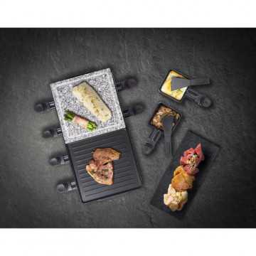Pour le plaisir de faire une raclette jusqu'a 8 personnes et de la déguster a table dans la salle a manger, sur le balcon, la terrasse ou dans le jardin. Plaque de grill réversible a revetement anti-adhésif (21x21cm) avec surface lisse et rainurée, plaque de grill résistante aux rayures et aux coupures (21x21cm) avec rainure a jus pour un résultat optimal sans ajout d'huile. Temps de chauffe rapide