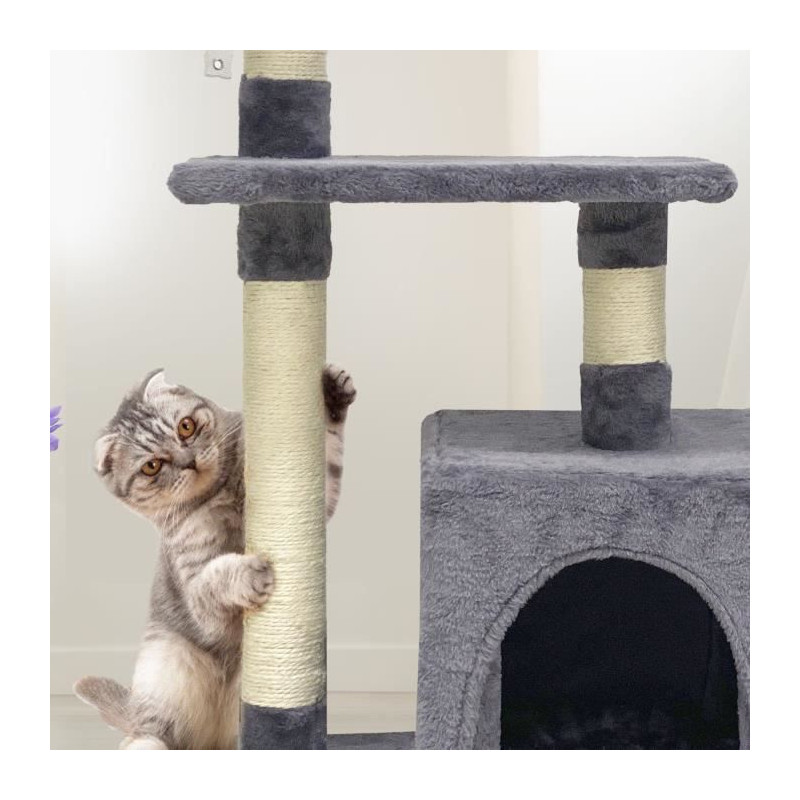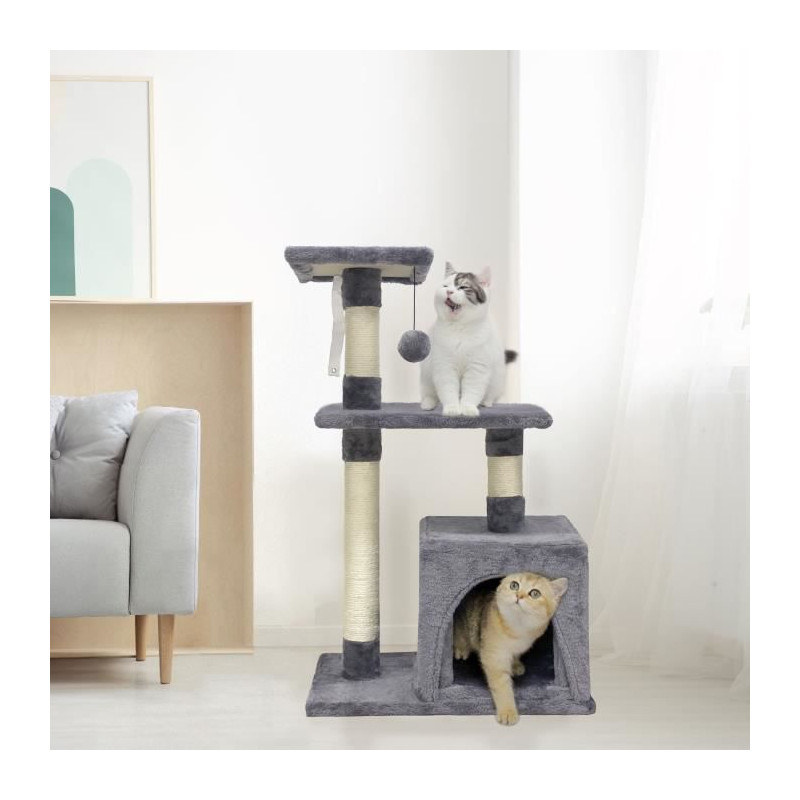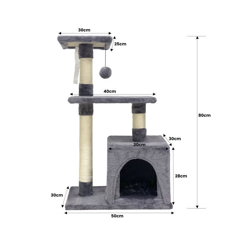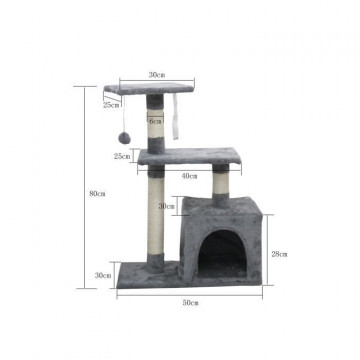 Petit arbre a chat avec niche et balle de jeu - ALC07 - Couleur gris - Dimensions : 50 x 30 x 80 cm - Structure : 2 plateformes, 1 balle de jeu, 1 niche et poteaux a griffer - Composition : tige en sisal de 7 cm de diametre, tissu court en peluche 220gsm, panneaux de fond - Poids net : 5.8 Kg