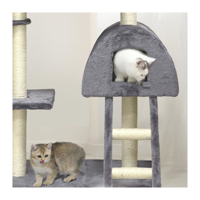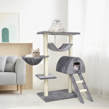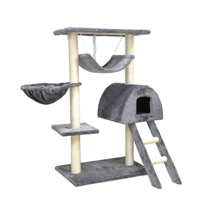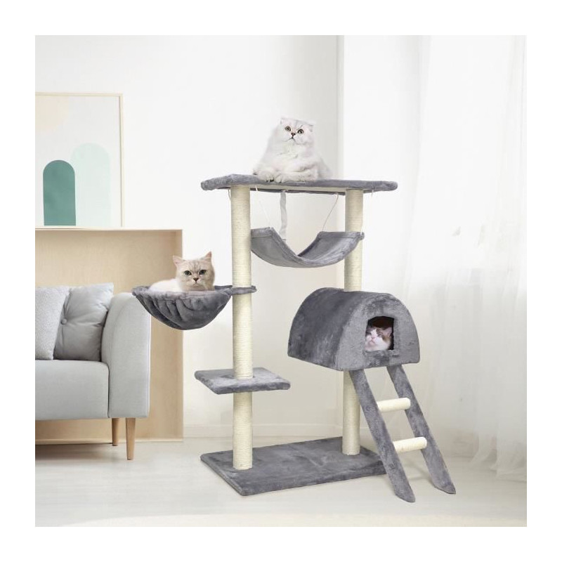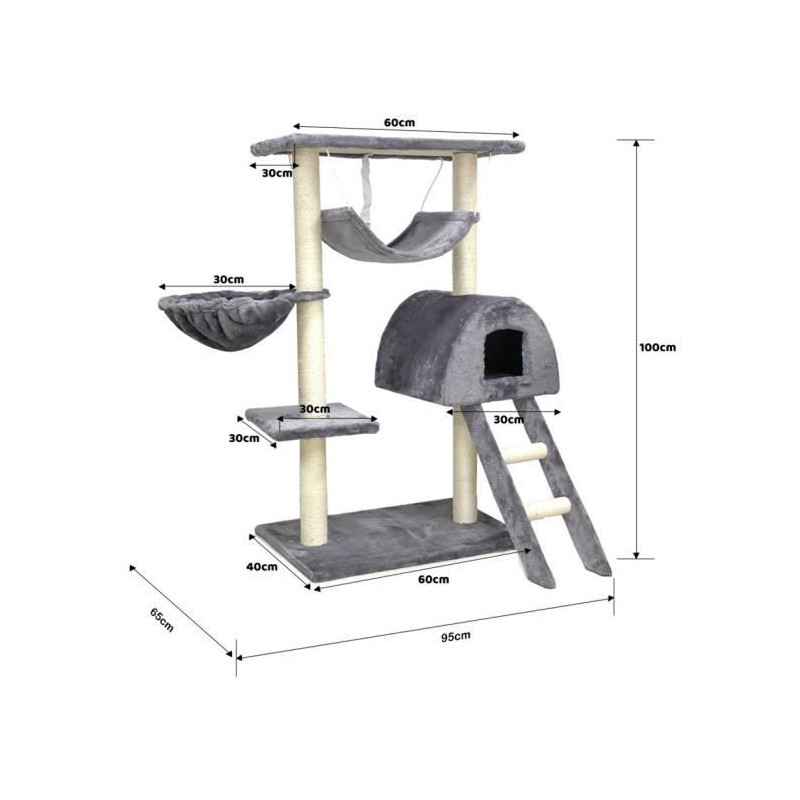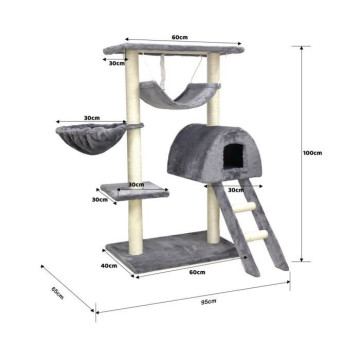Petit arbre a chat avec perchoir et hamac - ALC16 - Couleur : gris - Dimensions : 100X95X60 CM - Structure : 2 plateformes, 1 perchoir, 1 hamac, 1 escalier et poteaux a griffer - Composition : Tige en sisal de diametre 7 cm, tissu court en peluche 180gsm, panneaux de fond - Poids net : 9.3 Kg