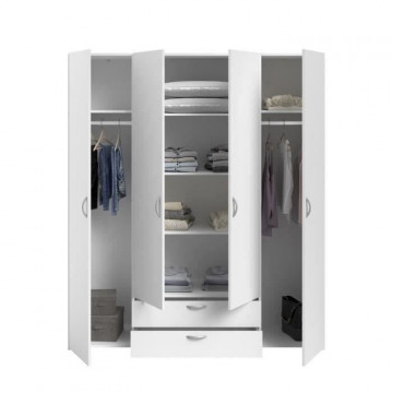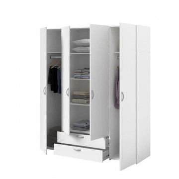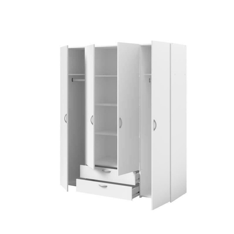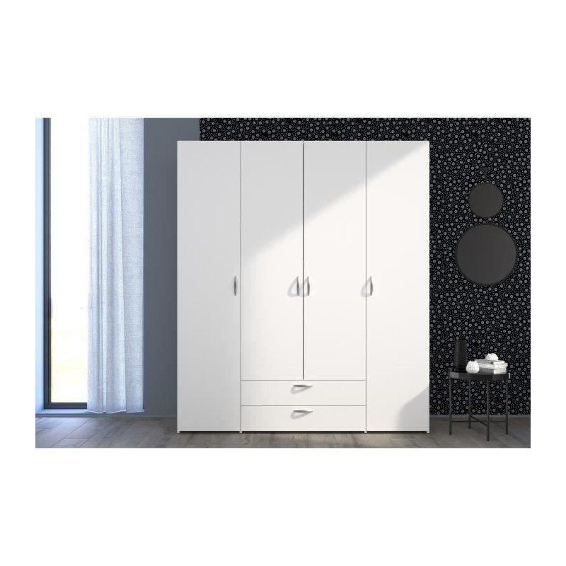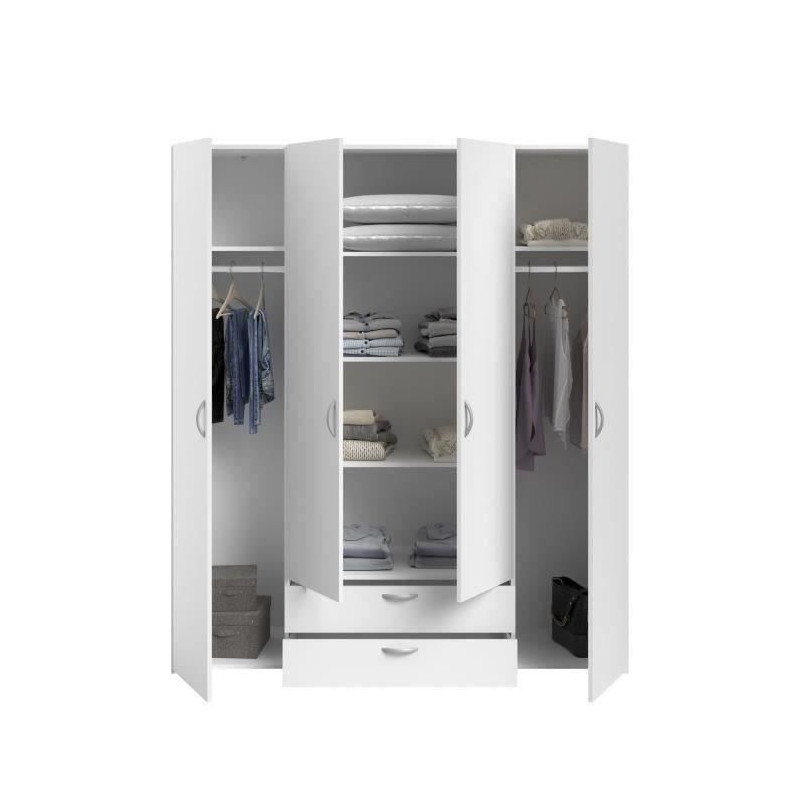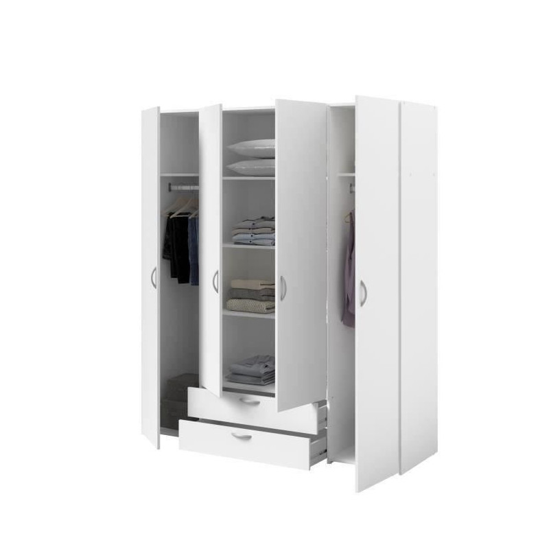 PARISOT Armoire de chambre 4 portes battantes + 2 tiroirs - Aménagement intérieur : une penderie a gauche et a droite avec 1 tringle et 1 tablette supérieure et une lingere avec 3 tablettes sur la partie centrale. Panneaux de particules revetus de papier décor blanc - Dimensions : L 160 x P 51 x H 185 cm - VARIA
