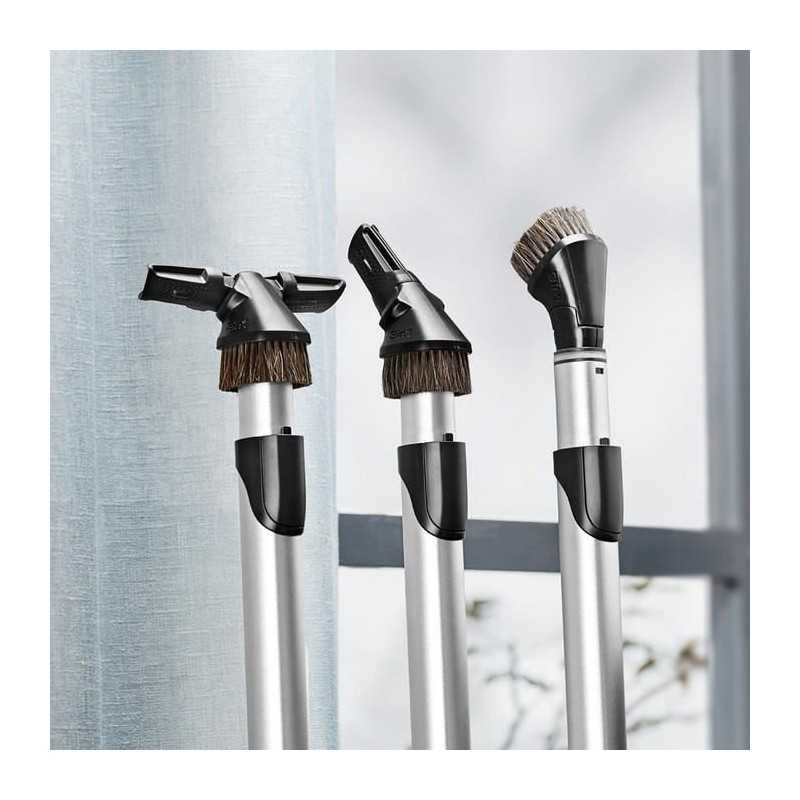 Gamme Pure D9 - 69 dB - Poignée ergonomique avec commandes a distance - Enrouleur de câble : 9 m - Rayon d`action : 12 m - Roues souples - Filtre moteur - Tube télescopique en alu de diametre 36 mm avec VHS - Flexible conique - Avec LED - Accessoire 3 en 1 intégré a l'arriere - 4 positions parking - Nozzle other.