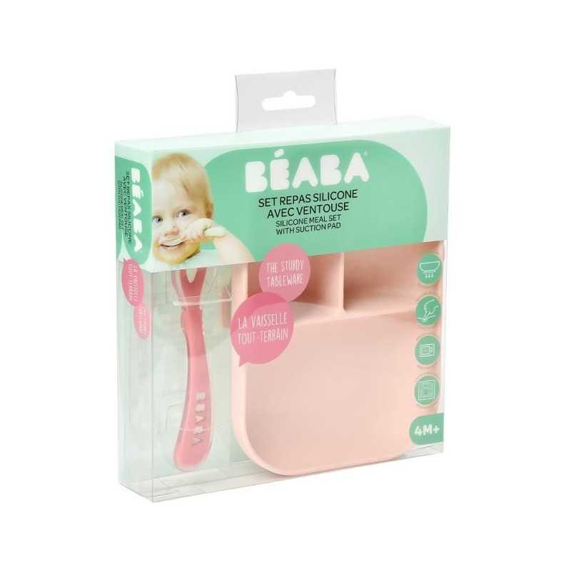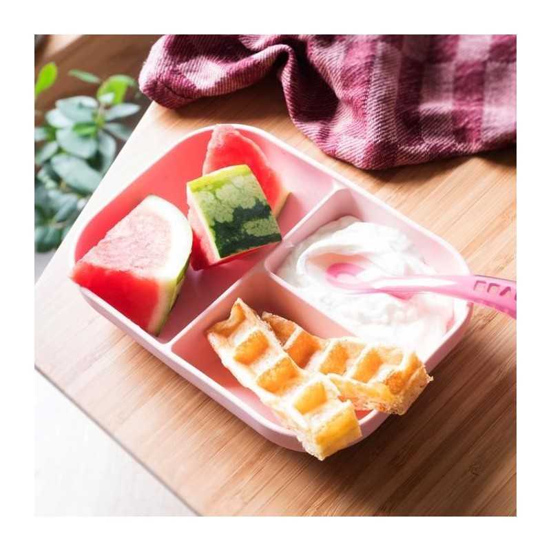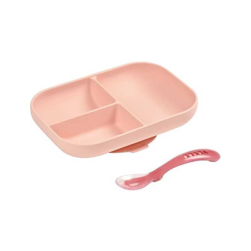 BEABA, Set Repas Bébé, Avec Ventouse, Anti dérapant, Assiette Silicone Compartimentée + Cuillere, Sain et Durable, Rose