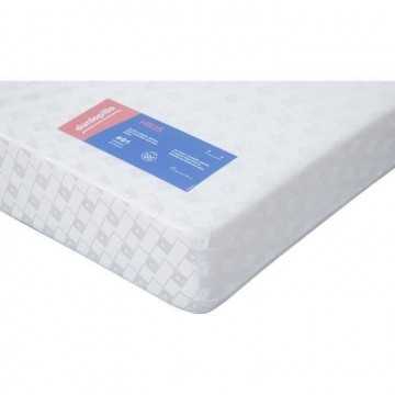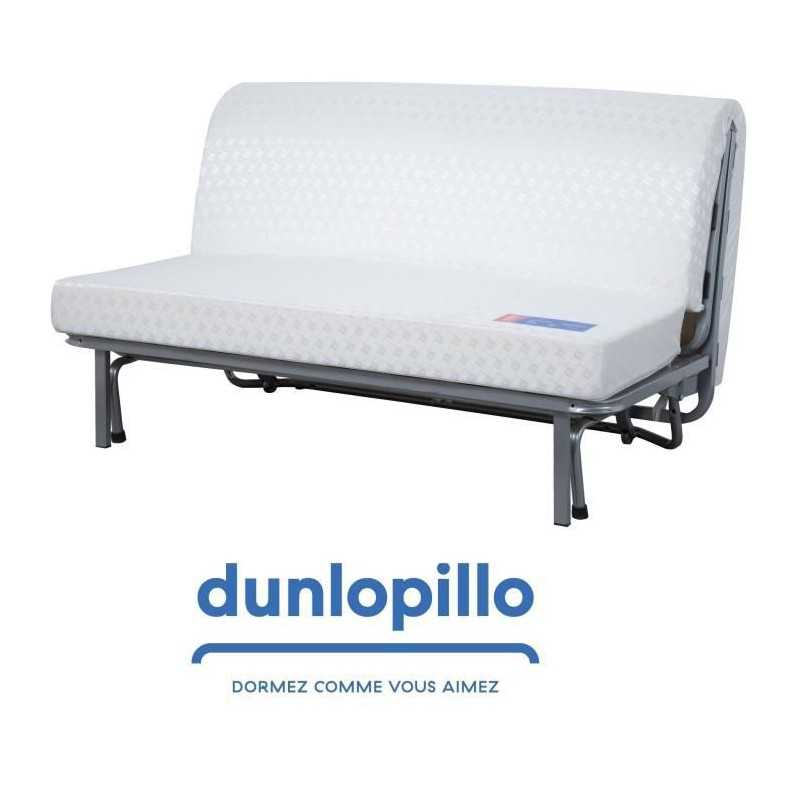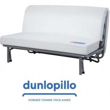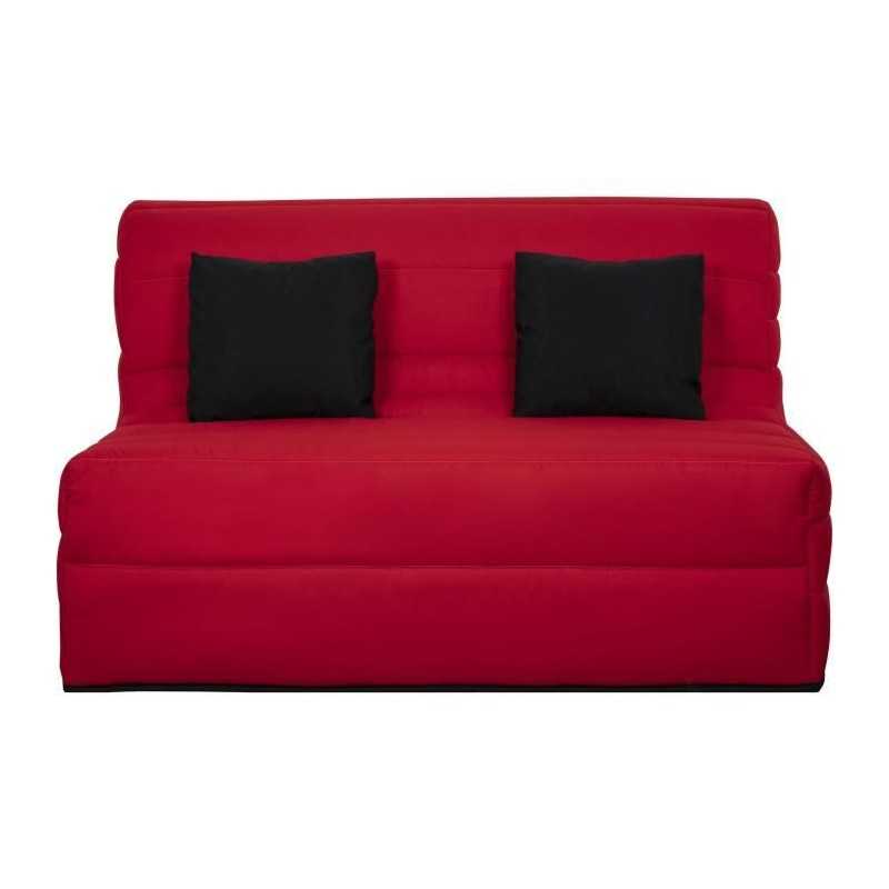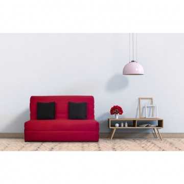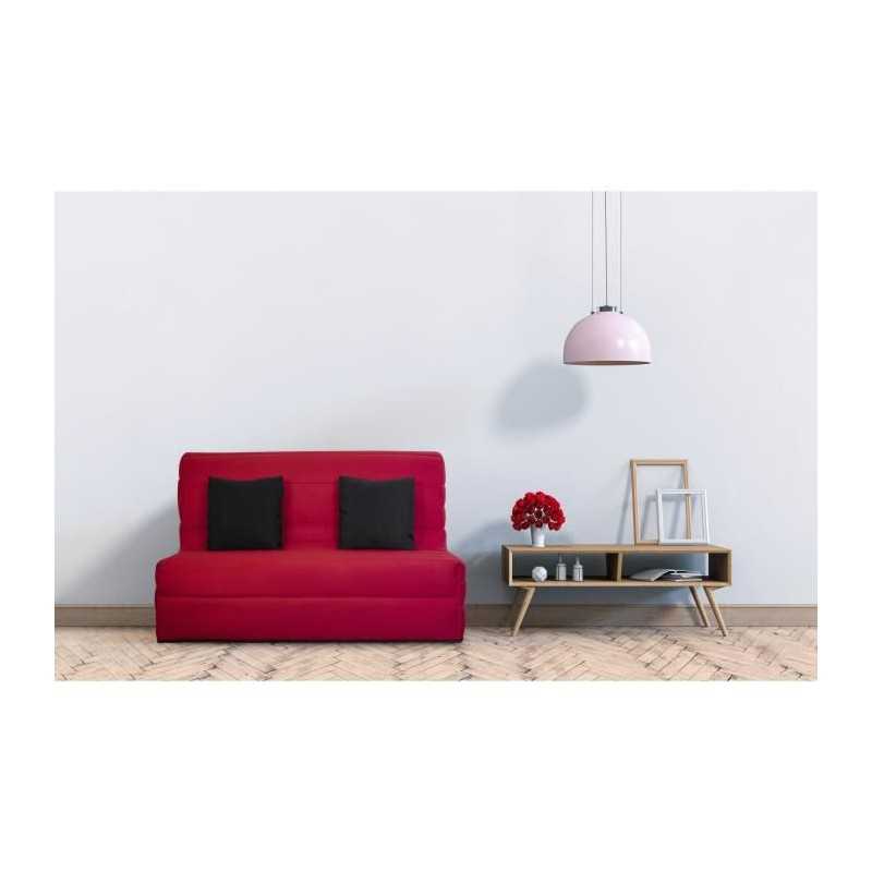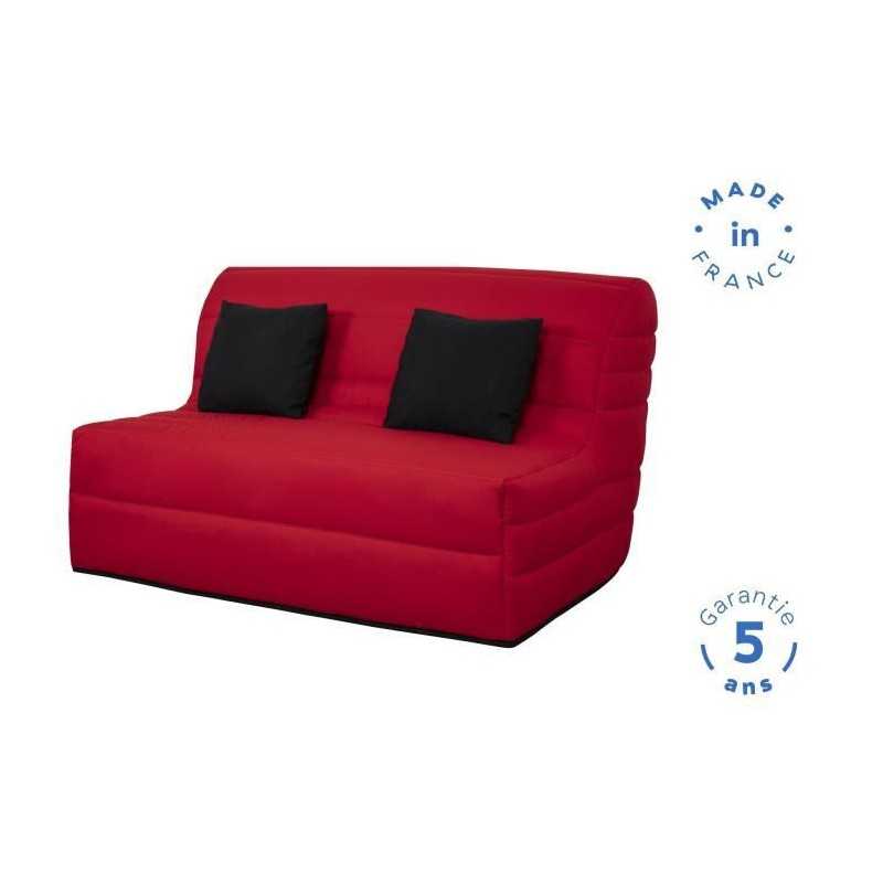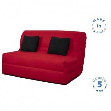 Banquette BZ Alice en tissu Pearl Rouge en 100% polyester Dimensions de couchage 140 x 190 cm Matelas DUNLOPILLO, épaisseur 12cm, mousse polyuréthane Haute Résilience 35kg/m3, plateau lisse, coutil jacquard, garanti 5 ans Ouate qualité 360g - 2 coussins carrés en tissu Uni noir en 70% coton 30% polyester