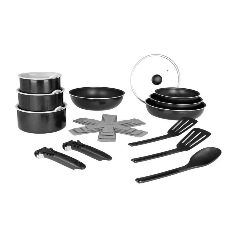 Avec 2 manches amovibles SITRAMOVIBLE Avec 3 cassroles Ø 16-18-20 cm, 3 poeles Ø 20-24-28 cm, 1 wok Ø 28 cm, 3 couvercles en plastique Ø 16-18-20 cm, 1 couvercle vapeur en verre Ø 28 cm, 4 feutrines Ø 20-24-28-32 cm, 2 spatules ajourées et 1 cuillere en nylon Tous feux dont induction
