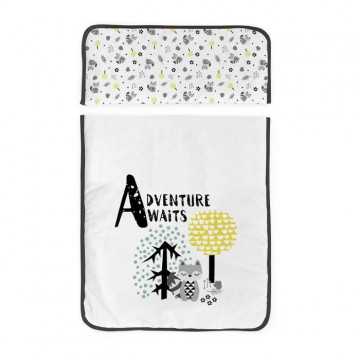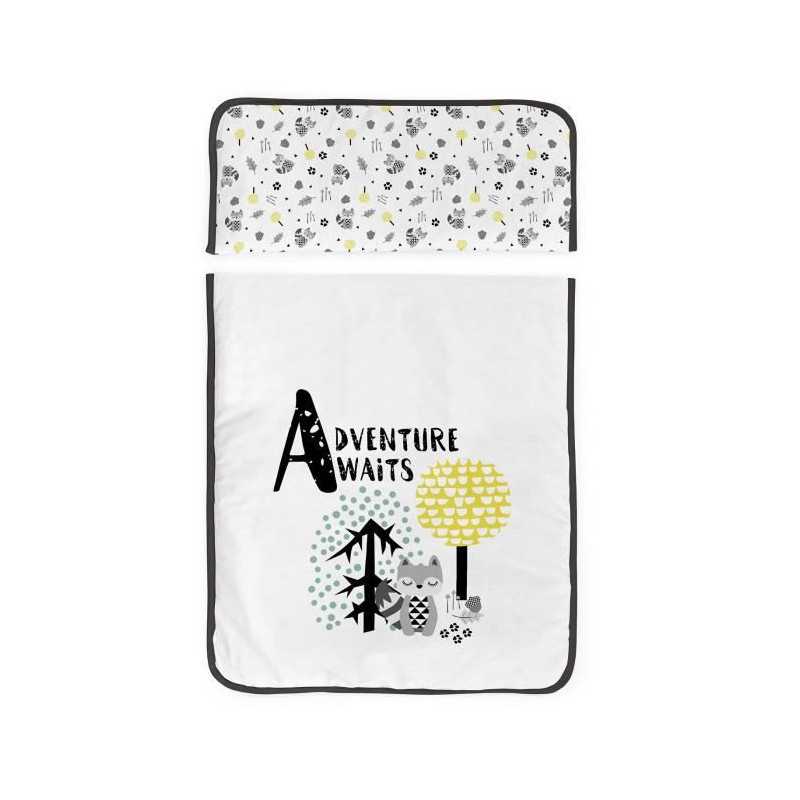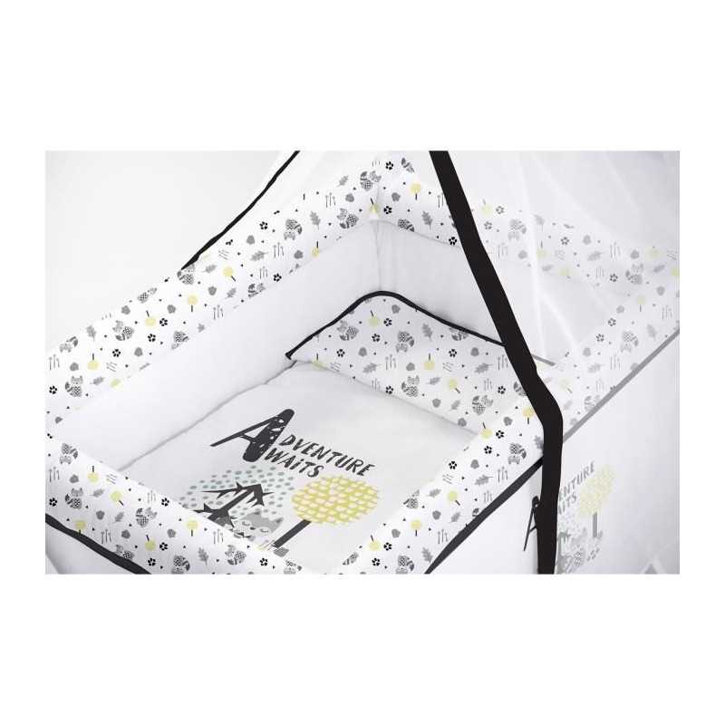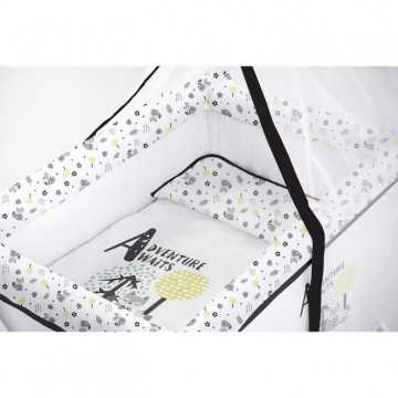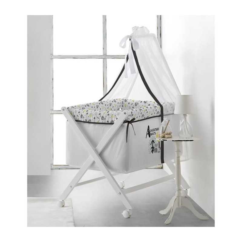 TANUKI - Berceau complet en bois "ADVENTURE AWAITS" blanc noir (Couette+taie d'oreiller+habillage textile berceau+Ciel de Lit+matelas+sommier) 100% coton de la naissance a 12 mois. Transport léger et facile. Fabriqué en bois de hetre de premiere qualité, muni de 4 roues dont deux avec freins.