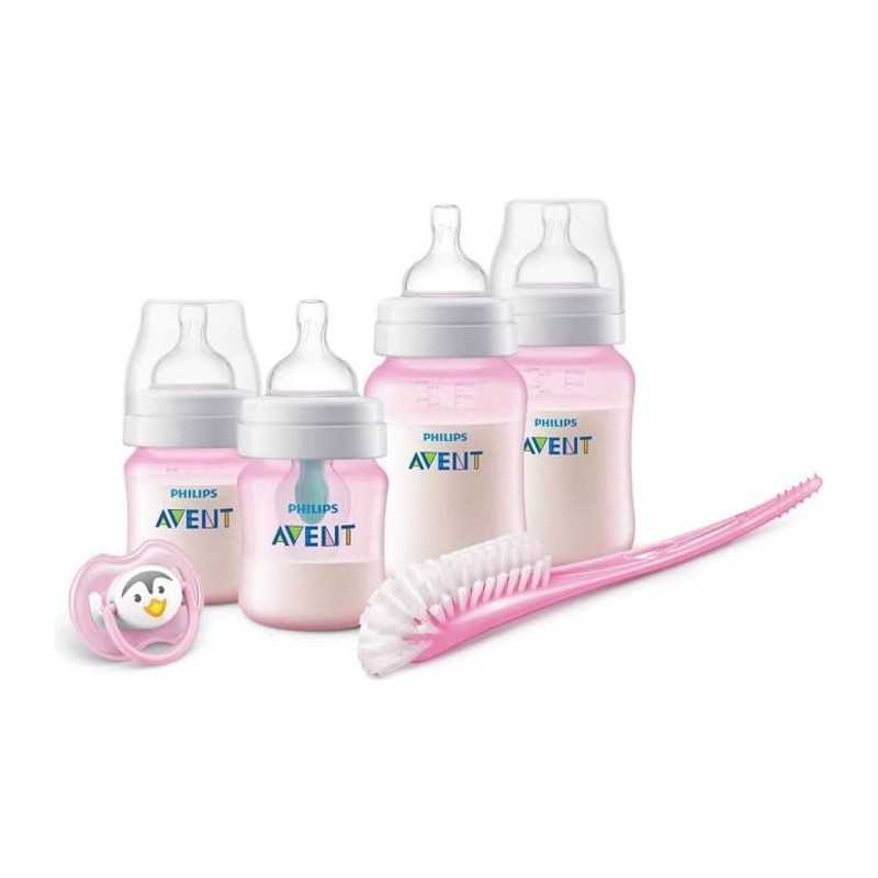 Kit Nouveau-né Anticolique : 2 x Biberons Anticolique Rose 125 ml - 1 x AirFree vent - 2 x Biberons Classic+ 260 ml - 1 x sucette transparente 0/6 mois - 1 x goupillon