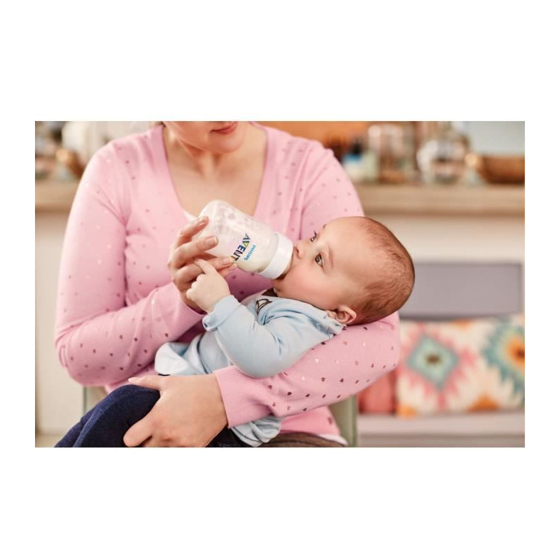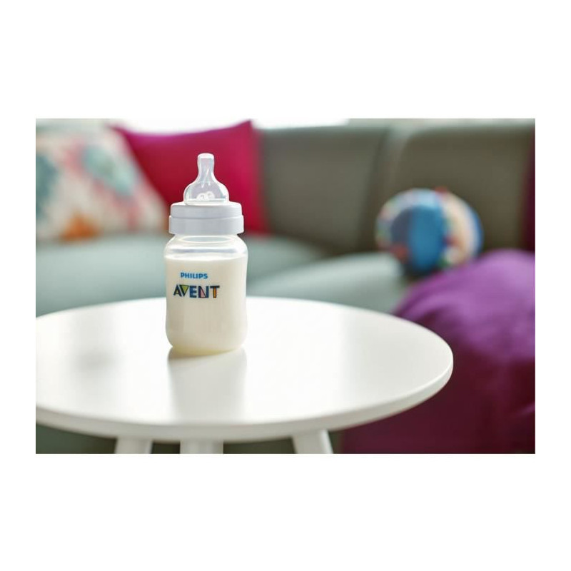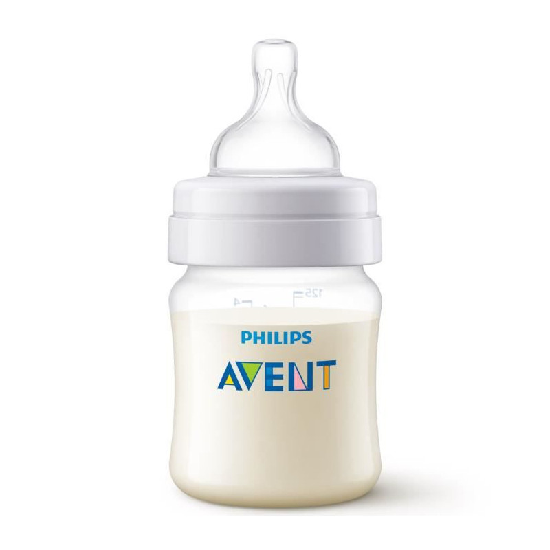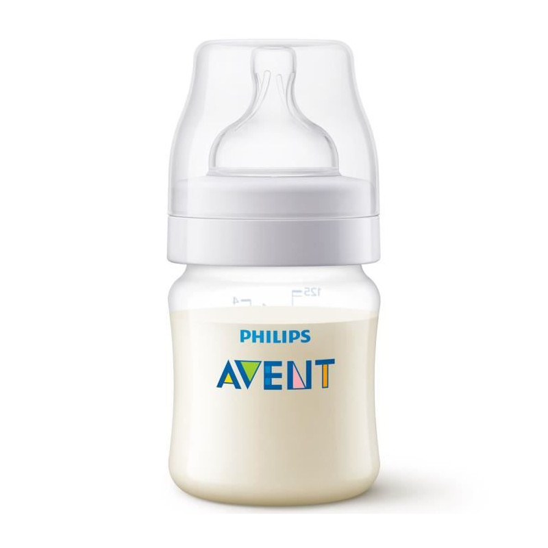 Avent Biberon Anti-Colique Sans Valve +0m 125ml est conçue pour permettre a votre bébé d'avaler moins d'air. La tétine reste pleine de lait, meme lorsque le biberon est a l'horizontale, pour faciliter l'alimentation en position assise. Limiter l'air ingéré par bébé aide a réduire les problemes courants liés a la tétée : les coliques, les gaz et les reflux.