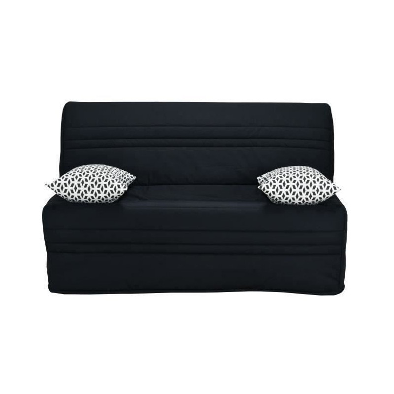 Banquette-lit BZ, Structure tube laqué noir.Couchage 140x190 (24 lattes) - Couette type "chaussette", Ouatinage 180gr/m2, doublure intissé. Tissu A150(noir) - 100% cotonMatelas monobloc HD24kg/m3, épaisseur 9cm.Paire de coussins déco déhoussables.Tissu A725 - 70% coton/30% Polyester - Livré en kit avec matelas roulé