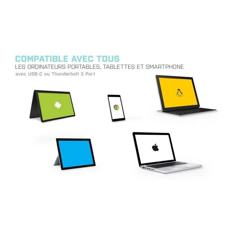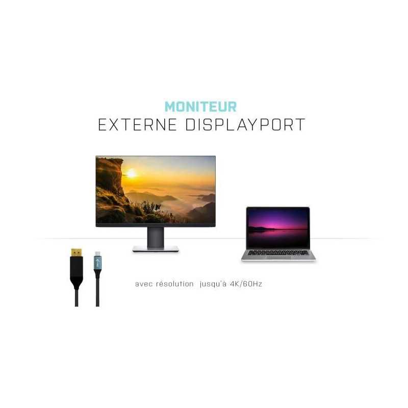 Élargissez le bureau de travail de votre ordinateur d'un écran externe d'affichage Display Port a travers le nouveau connecteur USB-C ou Thunderbolt 3. L'adaptateur filaire supporte la transmission de la vidéo avec la résolution 4K Ultra HD jusqu'a 3840 x