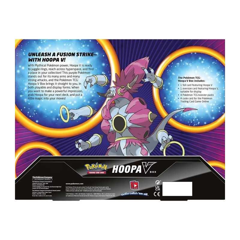 POKEMON - Ce coffret Pokemon TCG Hoopa V comprend 1 carte promotionnelle de Hoopa V, 1 carte surdimensionnée en aluminium de Hoopa V, 4 booster packs Pokemon TCG et une carte de code pour le jeu de cartes a collectionner Pokémon en ligne.