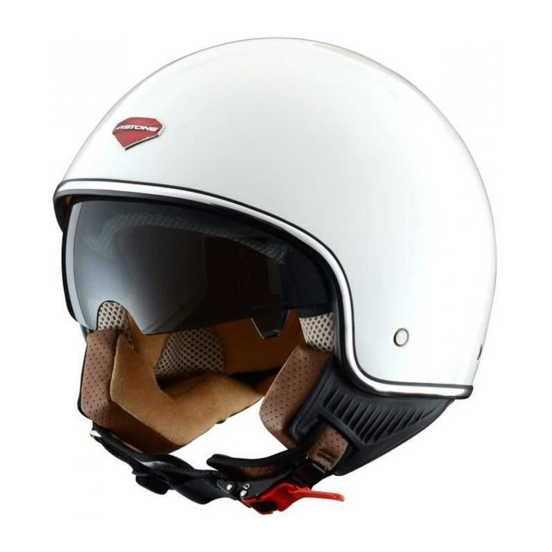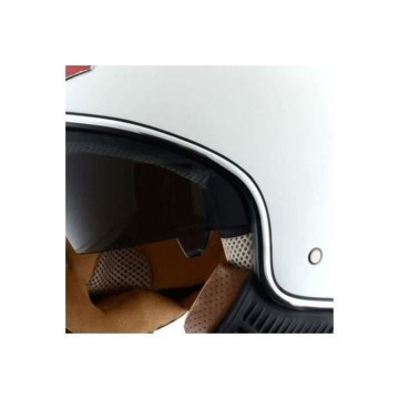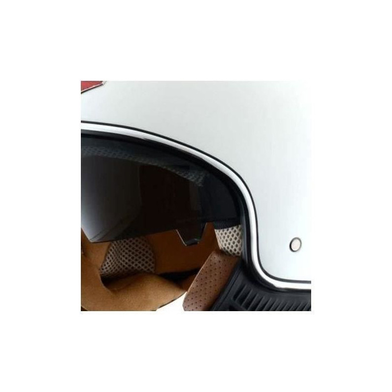 Casque MiniJet Retro au look vintage, calotte en polycarbonate injecté, coloris blanc, finition vernie. Lunette solaire rétractable. Intérieur hypoallergénique et antibactérien, démontable et lavable. Joues amovibles. Homologué ECE 2205. Joint d'écran chromé. Jugulaire boucle micrométrique. Poids 1050 g (±50 g).
