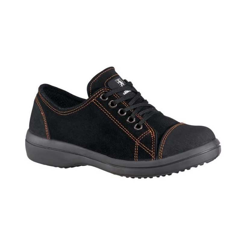 Chaussures de sécurité basses pour femme au look streetwear de coloris noir. En cuir finition velours dotée d'une semelle Parabolic a effet anti-fatigue. Doublure en textile 3D hyper respirant. Embout acier. Insert anti-perforation en acier inoxydable. Usage : manutention, industrie légere, transports, services.
