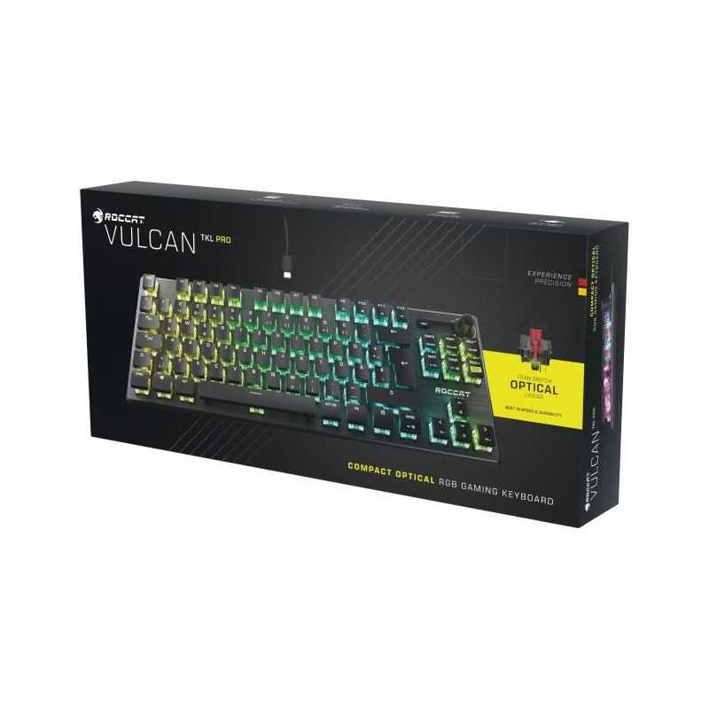 Le Vulcan primé est repensé dans un format sans pavé numérique et passe au niveau supérieur avec l'introduction du Titan Switch Optical de ROCCAT. Le nouveau design libere de l'espace sur le bureau pour une plus grande portée de mouvement de la souris et permet aux joueurs de placer leurs mains dans une position plus naturelle. Le nouvel interrupteur, merveille d'ingénierie optique, s'actionne a la vitesse de la lumi