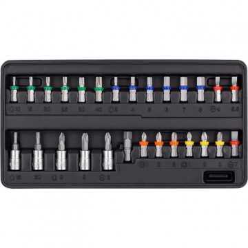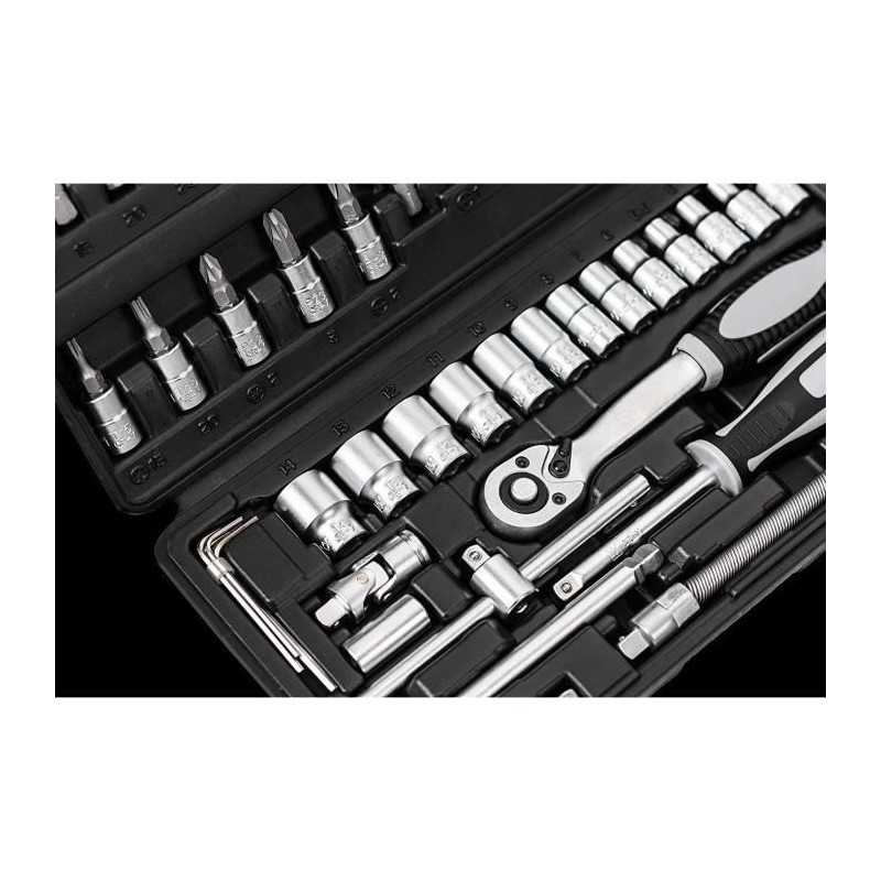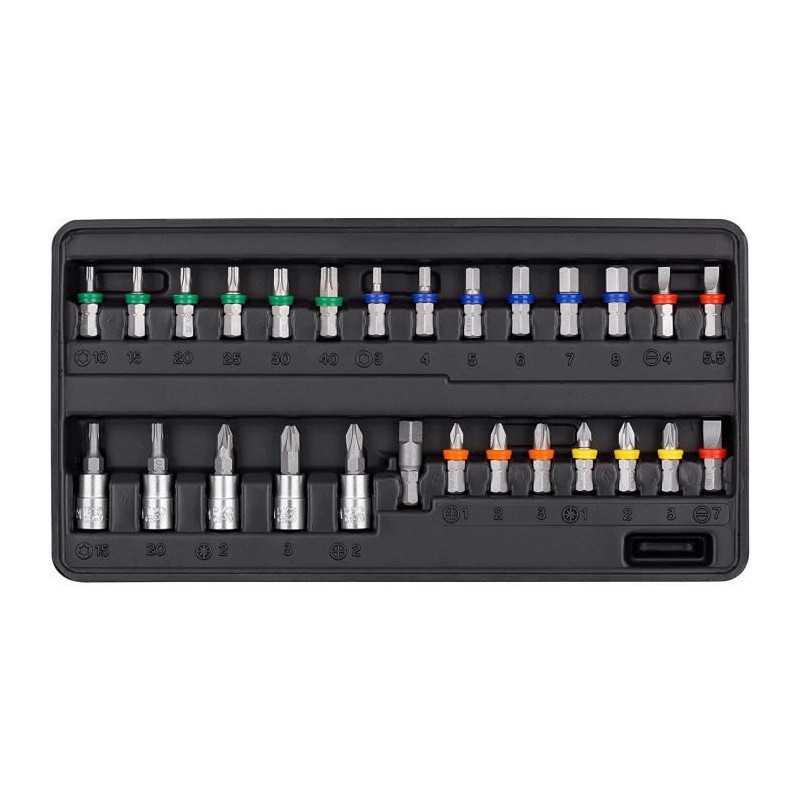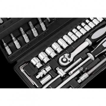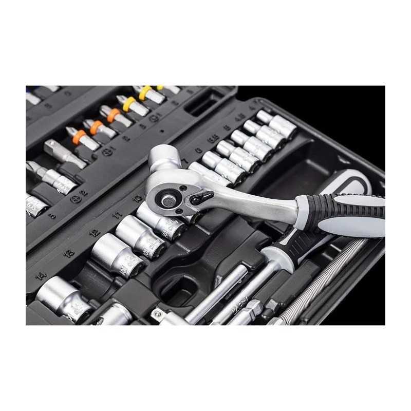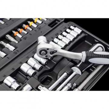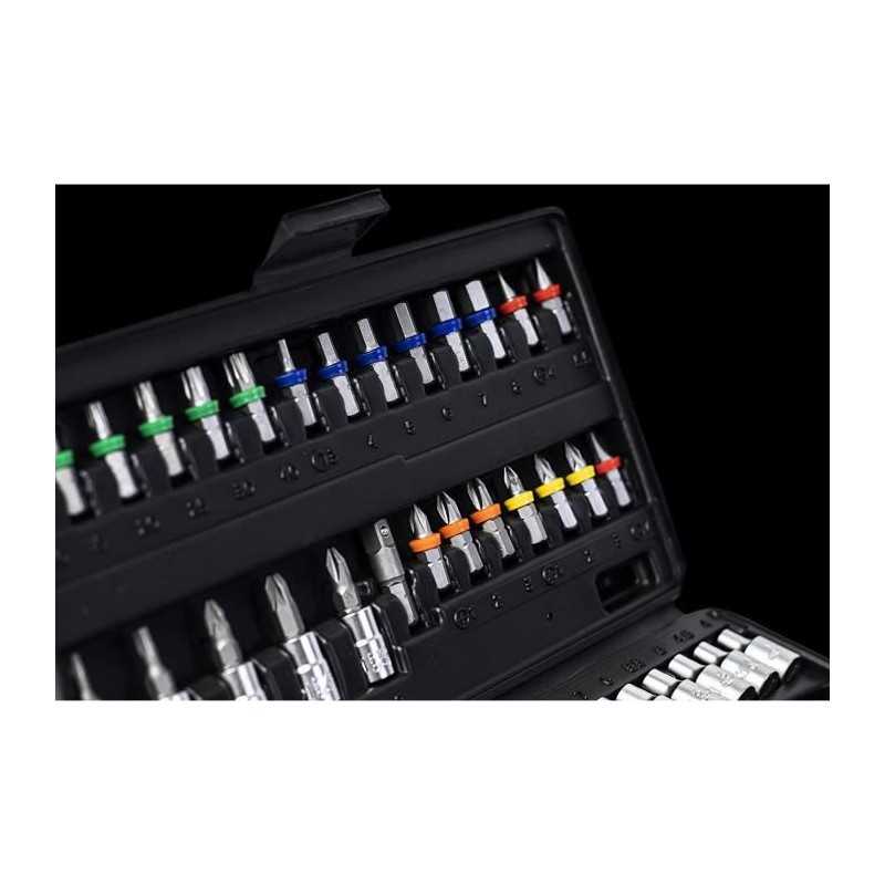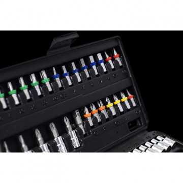 Équipement solide : équipement de base idéal pour divers travaux de vissage dans le bricolage, l'atelier, le garage, etc. | Grand choix de douilles, embouts et accessoires | Avec cliquet réversible. - Bonne finition : cliquet réversible avec 72 dents et fonction de déblocage rapide | Douilles en acier chrome-vanadium robuste | Embouts avec code couleur pour une identification facile | Coffret en plastique robuste
