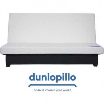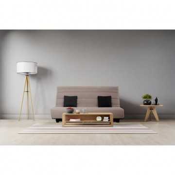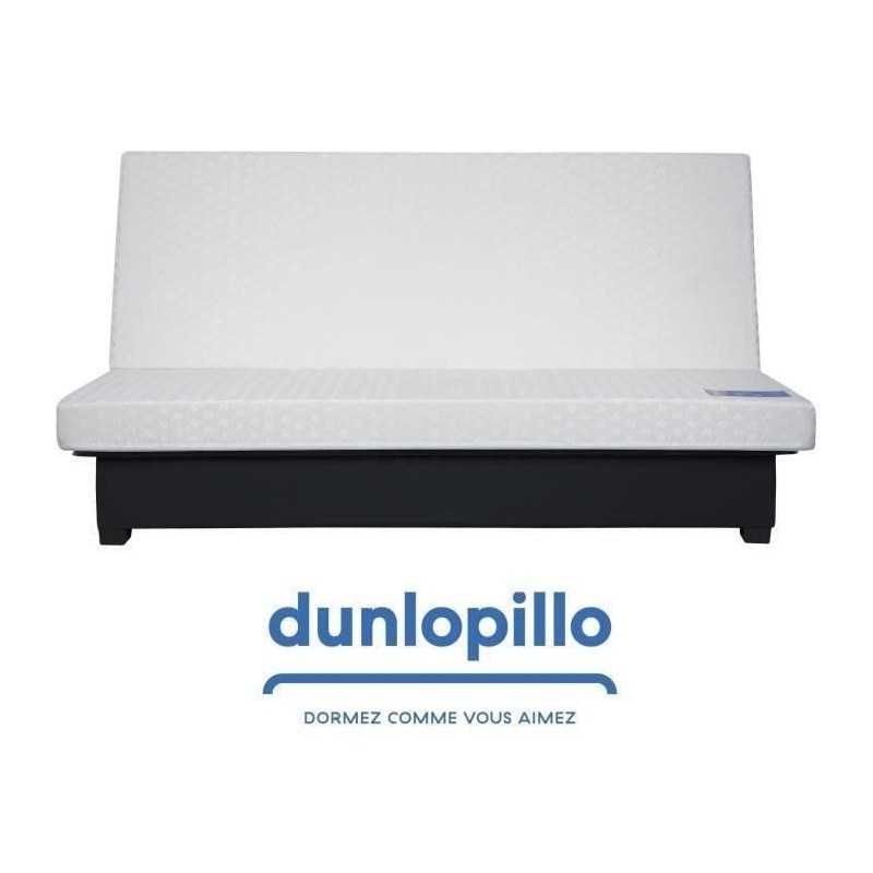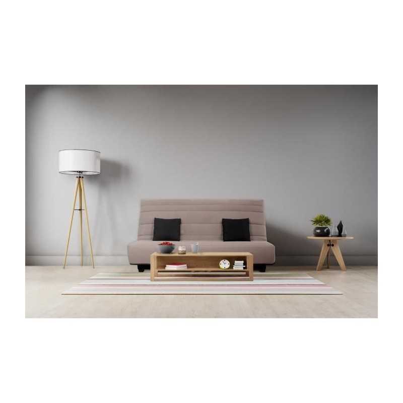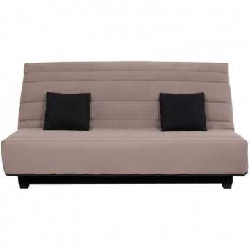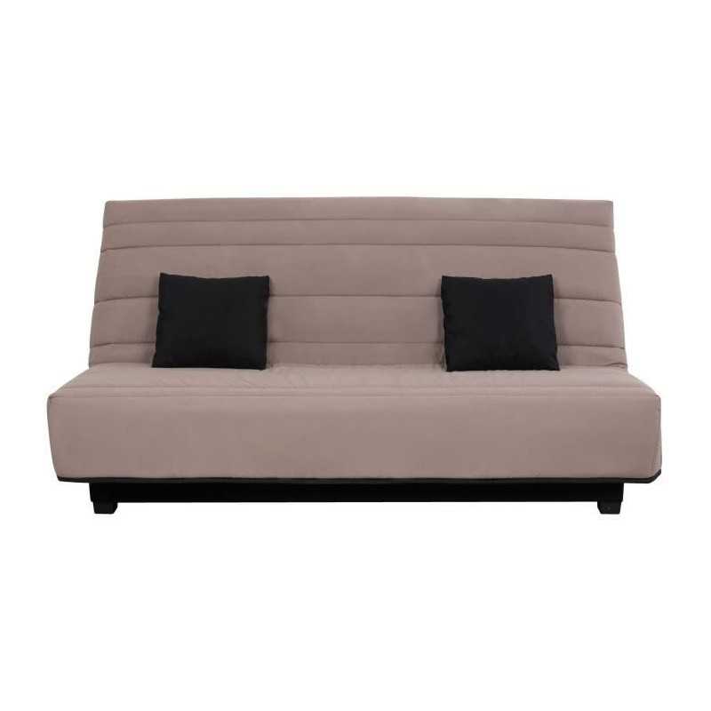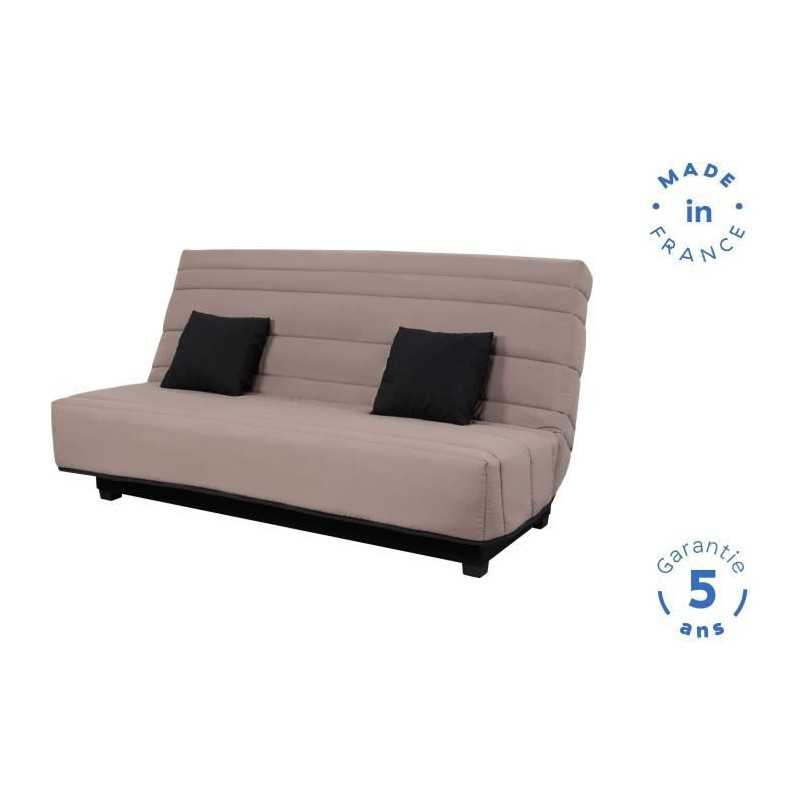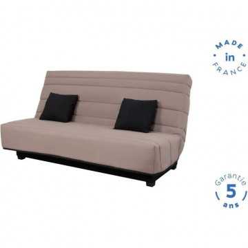 Banquette Clic clac Alex en tissu Pearl Taupe 100% polyester Dimensions de couchage 130 x 190 cm Matelas DUNLOPILLO, épaisseur 12cm, mousse polyuréthane Haute Résilience 35kg/m3, plateau lisse, coutil jacquard, garanti 5 ans Ouate qualité 360g - 2 coussins carrés en tissu Uni Noir 3 en 70% coton 30% polyester