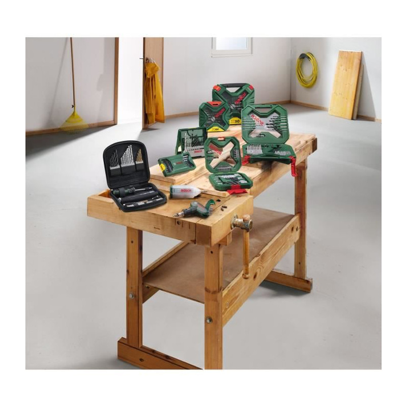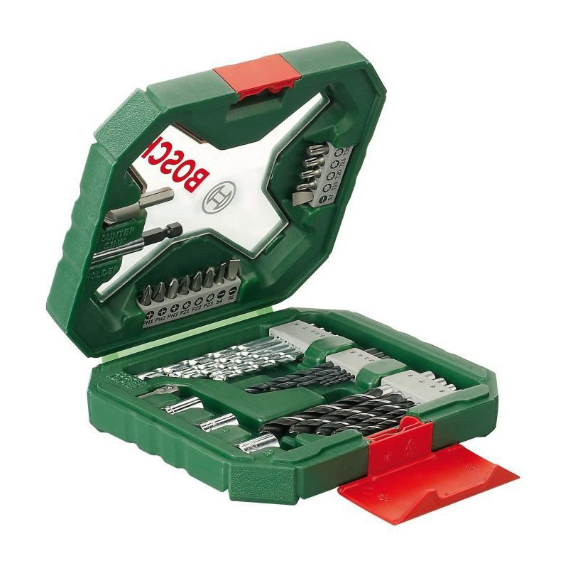 Coffret BOSCH X-Line comprenant 34 pieces : embouts de vissage PH/PZ/Plat/T, 5 forets maçonneries 5 a 8mm, 5 forets a métaux HSS 2 a 5mm, 5 meches a bois 4 a 8mm, 3 douilles 7/8/10mm & adaptateur, 1 porte-embout magnétique universel et 1 fraise conique a lamer - Fonctions : perçage & vissage - Utilisation dans : le bois, le métal et autres matériaux - Supports amovibles.