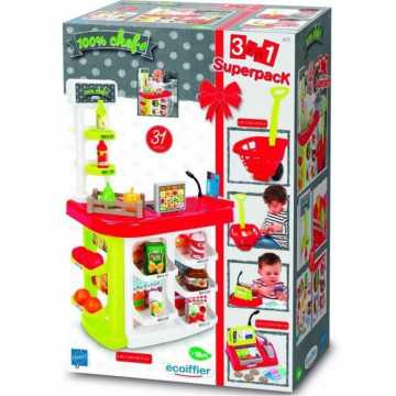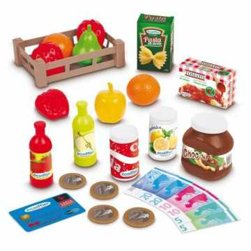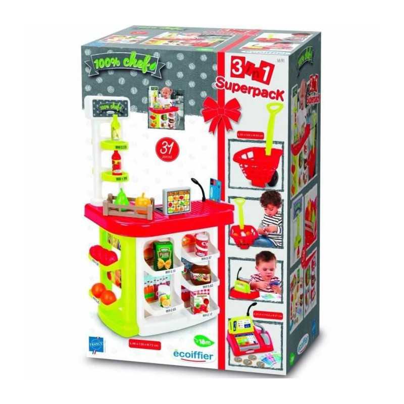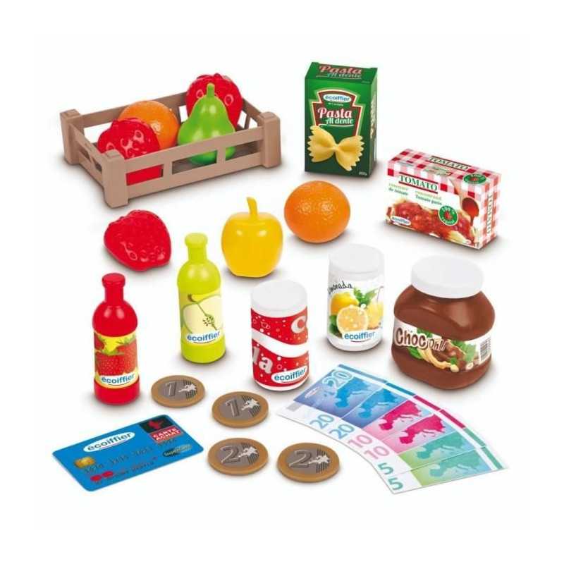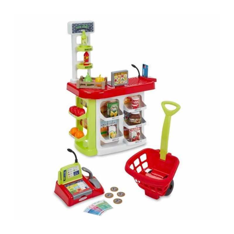 Une caisse de supermarché remplie de produits a acheter, une carte bleue, un micro, un terminal CB, une balance pour les fruits et légumes et un panier roulant Vient s'ajouter une caisse enregistreuse mécanique garnie de pieces et de billets, d' un lecteur de gencode, d'un téléphone et d'un micro. 31 pieces. Des 18 mois. Origine France Garantie