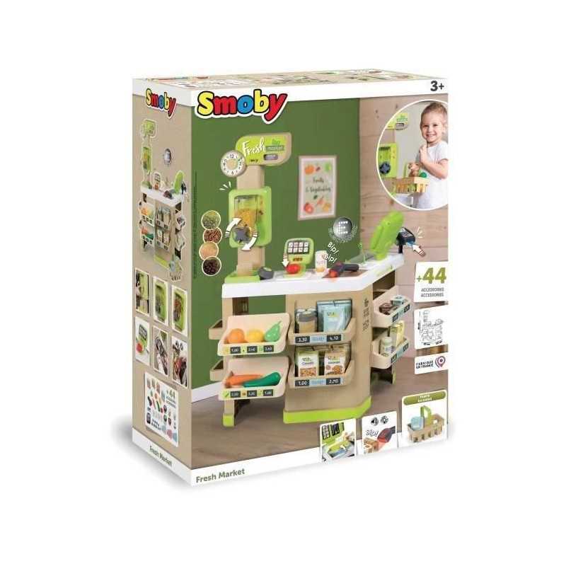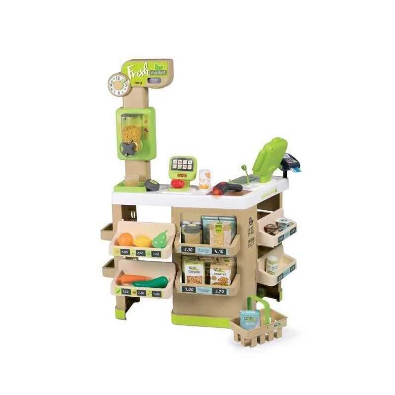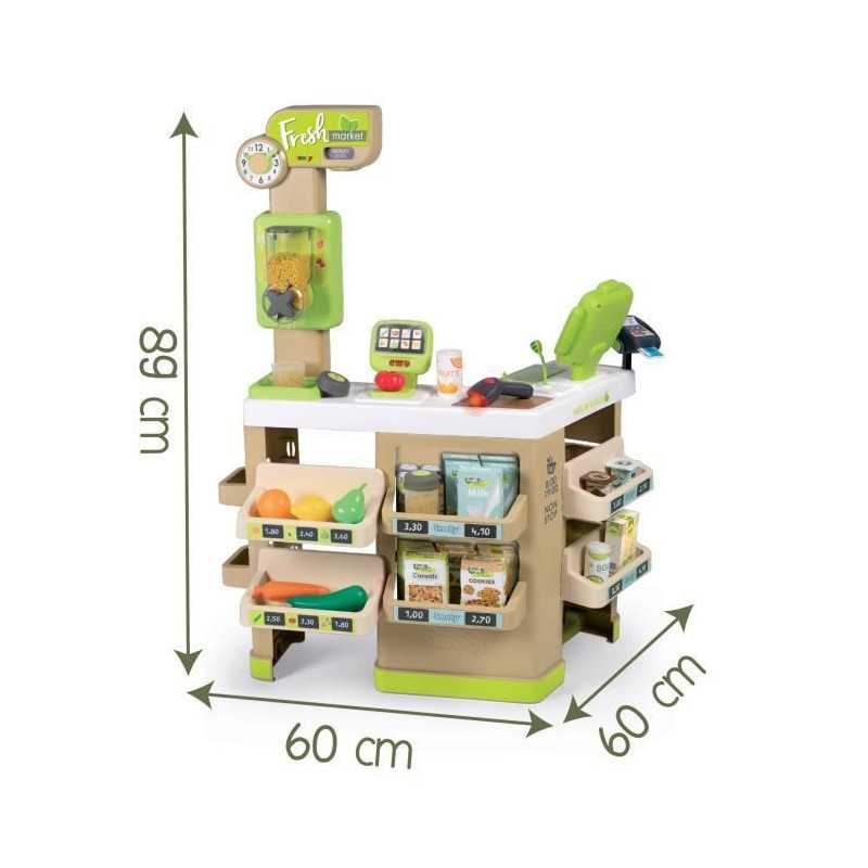 Avec la Fresh Market tu pourras créer ton propre magasin bio. De nombreux espaces de jeu composent cette marchande, te permettant ainsi de te plonger dans la peau d'un véritable vendeur. En plus du coin fruits/légumes, et du passage en caisse, tu pourras t'amuser a peser tes légumes grâce a la balance mécanique : le poids affiché s'ajuste en fonction des aliments pesés. Le distributeur de nourriture en vrac te plaira