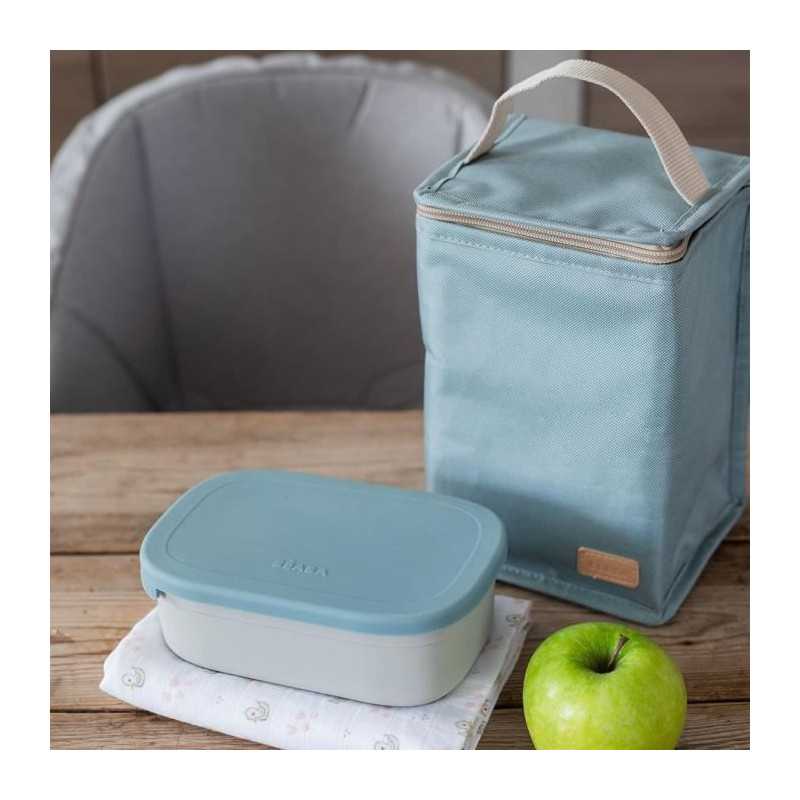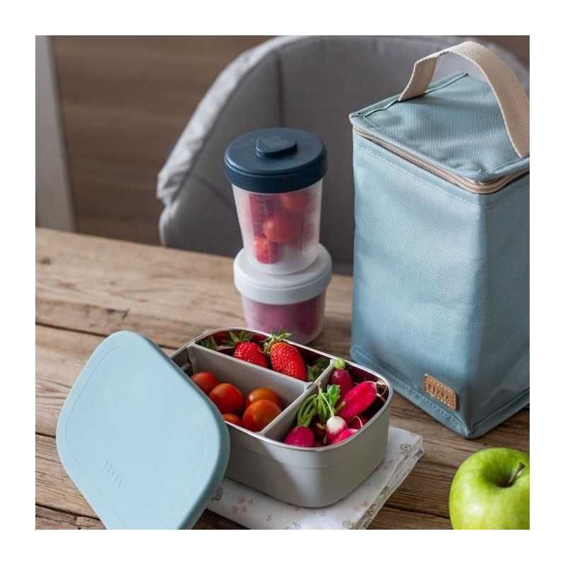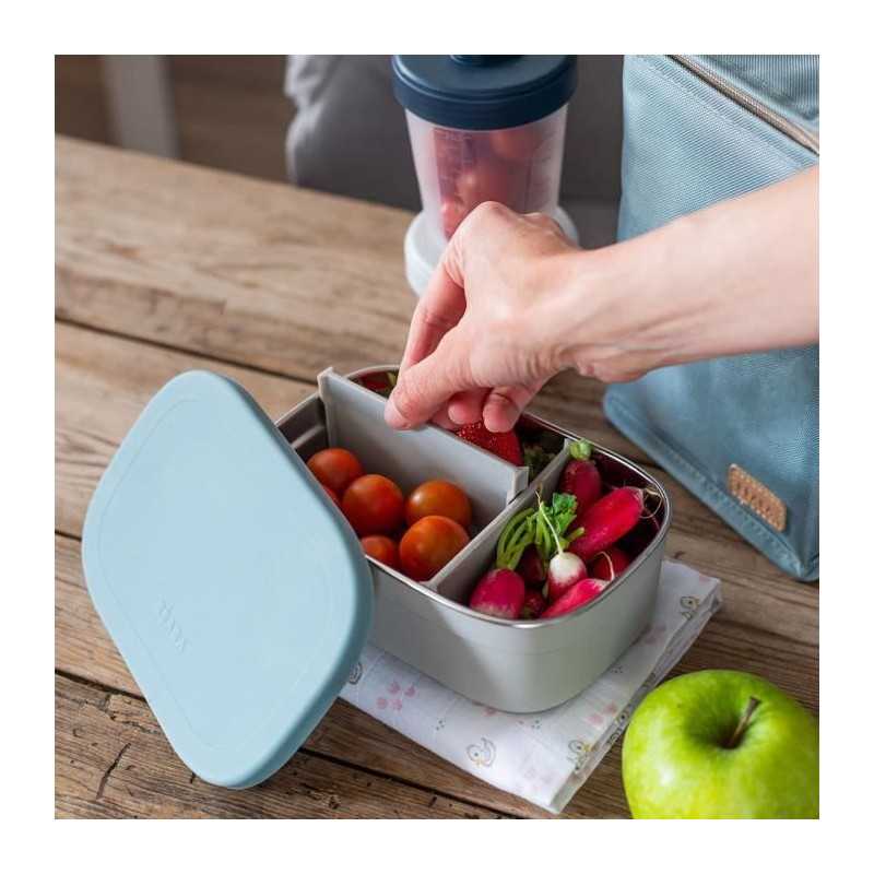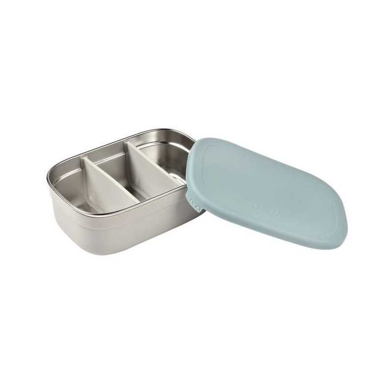 BEABA, Boîte repas enfant en inox, couvercle en silicone et housse de protection, Gris velours et bleu