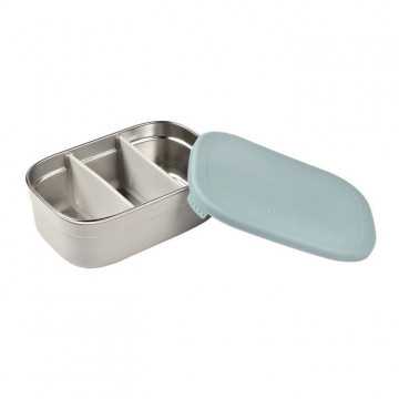 Une boîte en acier inoxydable avec housse de protection et couvercle en silicone, idéal pour transporter le repas ou le goûter des petits gourmands.