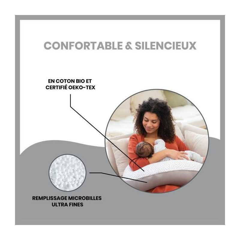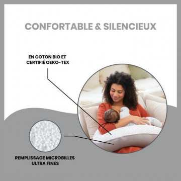 Soulage le dos, les jambes et le ventre pendant la grossesse - Soulage le dos et les bras du parent pendant l'allaitement ou le biberon - Maintient bébé a hauteur idéale pour l'allaitement ou le biberon - Confortable et silencieux (fines microbilles) - En coton bio et oeko-Tex - Housse lavable en machine - 11 coloris