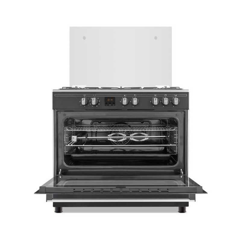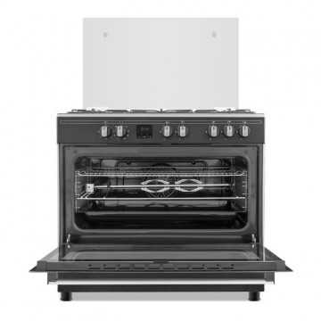 Cuisiniere piano, table de cuisson inox, 5 foyers gaz, allumage 1 main, four catalyse 95L, 8 programmes, multifonction, gril, éclairage intérieur, minuteur, affichage digital, porte du four démontable, pieds réglables, NOIR MAT, Garantie 2 ans pieces main d'oeuvre et déplacement