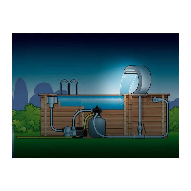 Cascade en inox 316L résistant au chlore - alimentée par le circuit de refoulement de la filtration (connections en 38mm fournies) - Réglette de 20 LEDS bleus intégré a la cascade - Livré avec les accessoires pour un branchement aisé a votre piscine - Garantie 2 ans