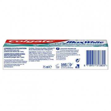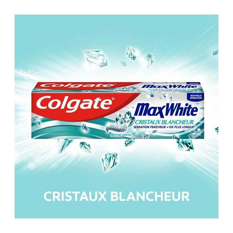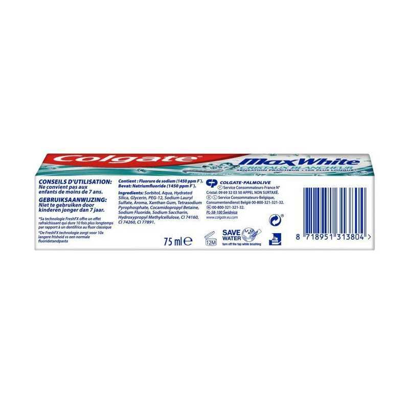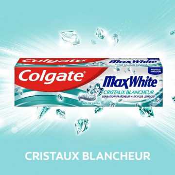 Le dentifrice Colgate MaxWhite avec cristaux blancheur ravive la blancheur naturelle de vos dents. De plus, sa technologie Fresh FX offre un effet rafraîchissant qui dure 10 fois plus longtemps (par rapport a un dentifrice au fluor classique).