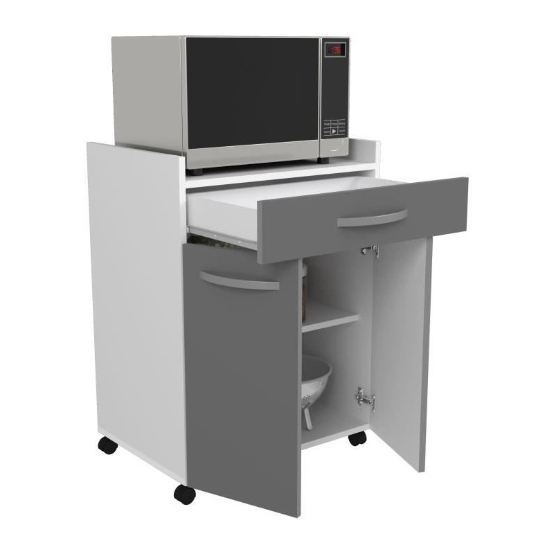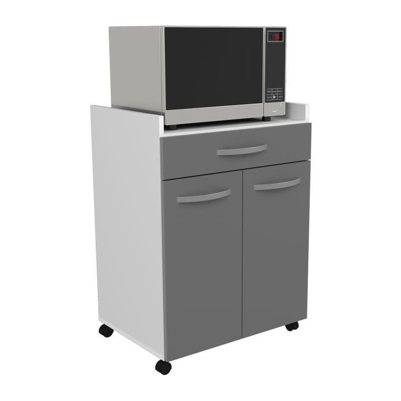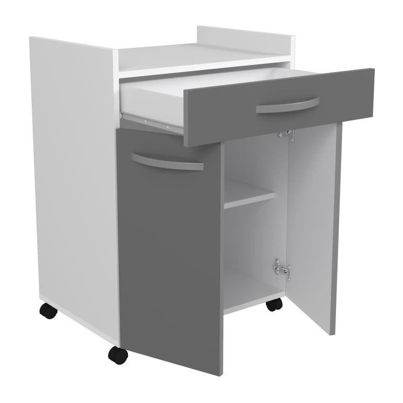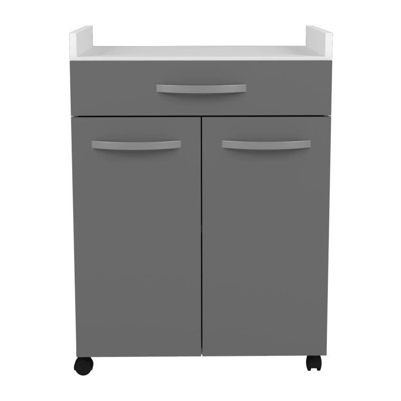 Desserte de 60 cm avec 1 tiroir et 2 portes, Structure et façades en panneaux de particules mélaminé 16 mm. Charnieres métalliques a rappel automatique -Poignées plastique finition gris métallisé Fabrication française