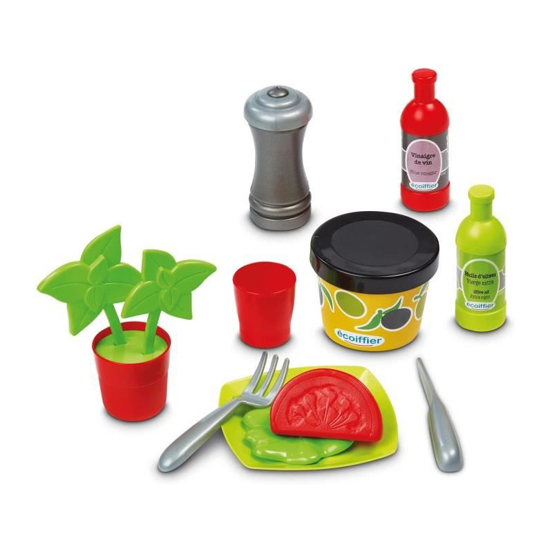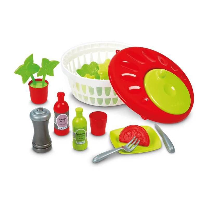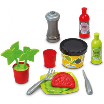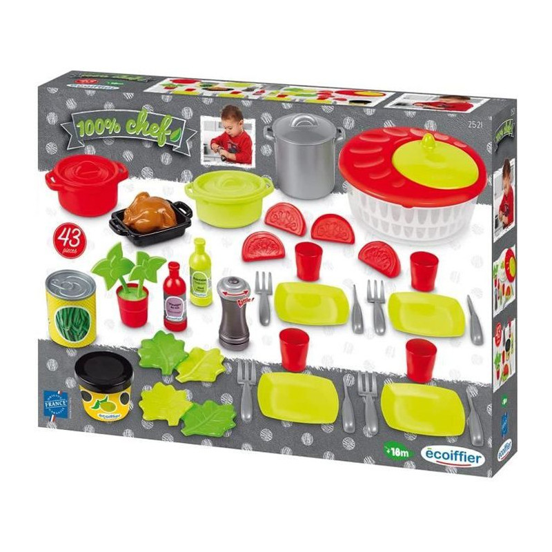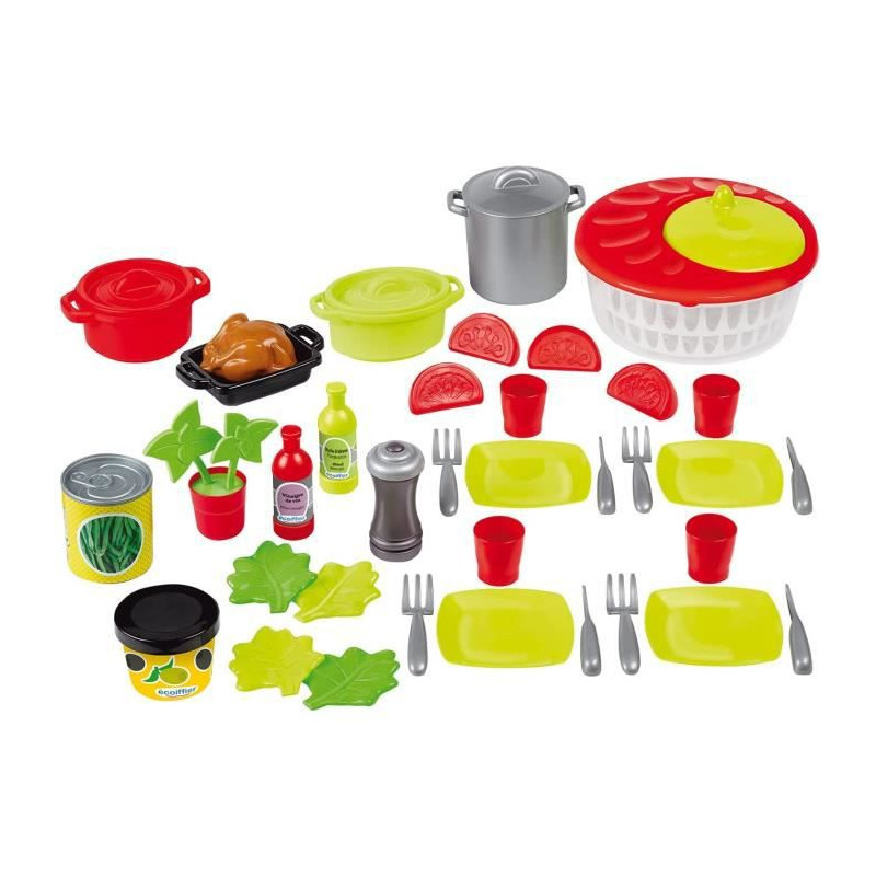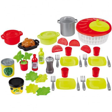 Ce kit de dinette contient de nombreux accessoires dont une essoreuse a salade, des marmites, une poivriere, du basilic, du poulet .....43 pieces .Des 18 mois. Origine France Garantie