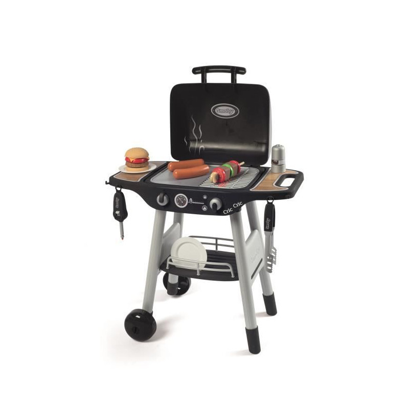 Ton barbecue dispose d'un côté grill et d'un côté plancha ! les flammes apparaissent ! 18 accessoires sont inclus : 1 hamburger avec 5 éléments a assembler, 1 brochette a composer, 1 allume gaz cric crac, 1 pince, 2 saucisses, 2 assiettes, et 1 moulin a sel/poivre cric crac. A partir de 3 ans - Fabrication française. Tu vas pouvoir aider papa et maman a faire a manger avec ton barbecue sur pieds ! Avec le temp