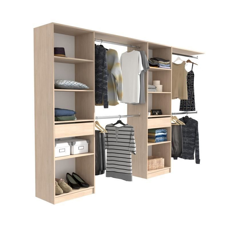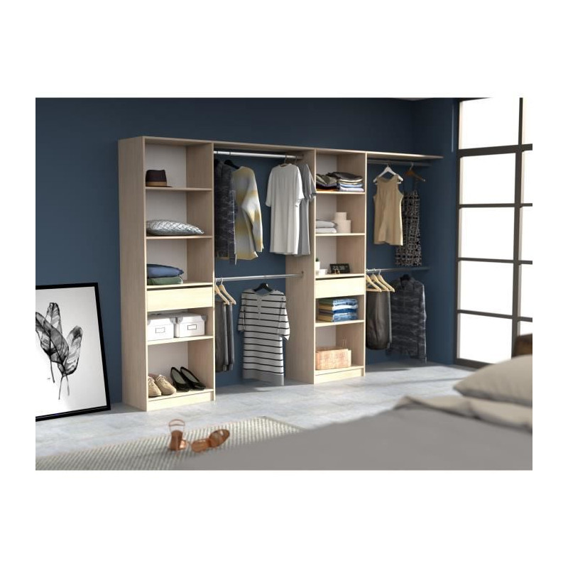 EKIPA Dressing extensible - 2 colonnes avec 2 tiroirs et 10 étageres + 4 penderies - Décor chene - L 320 x P 40 x H 200 cm - D