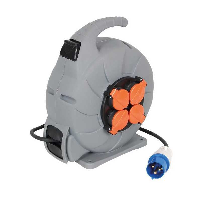 Rappel auto du câble en appuyant sur un simple bouton - Fiche mâle CEE 17 - Ilot fixe 4 prises femelles Schuko - Disjoncteur thermique - Tension : 220 V - Intensité : 16 A - Puissance maximale : 3000W (câble déroulé) / 1000W (câble enroulé) - Classe de protection : IP44 - Câble : 3 x 1,5 mm2 longueur 15 m - Stop-câble réglable