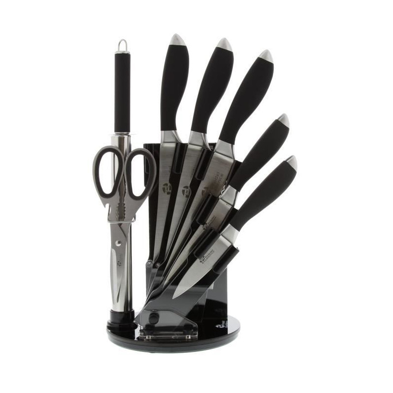 Bloc tournant 7 pieces en acier inoxydable comprenant : 1 couteau office 8,5cm, 1 couteau militaire 11cm, 1 couteau-chef 20cm, 1 couteau pain 20cm, 1 couperet 2,5cm, 1 fusil et 1 ciseau, coloris noir. Manches ergonomiques pour une bonne prise en main. Compatible au lave-vaisselle.