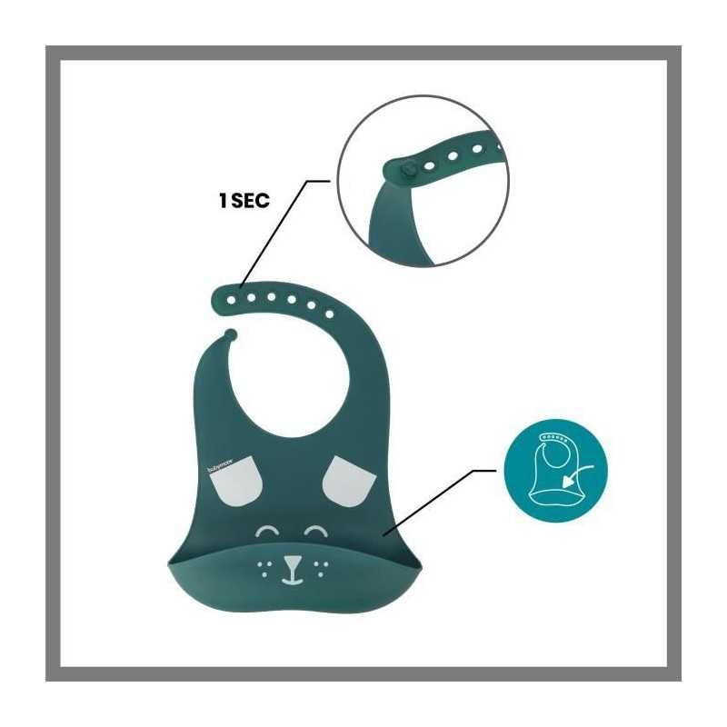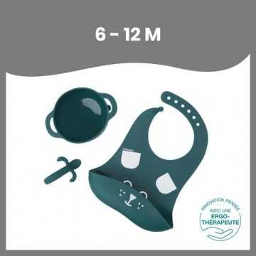 Contient 1 bol, 1 cuillere et 1 bavoir - Aide au développement de la motricité fine -Cuillere avec son manche multiple préhension 360°- Bol antidérapant grâce a sa ventouse -Bavoir avec récupérateur et d'une ouverture avec crans -Tous les éléments du set passent au lave-vaisselle -Le bol passe au four et au micro-onde