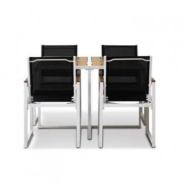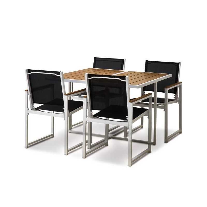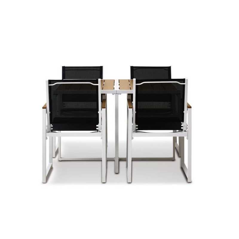 Notre ensemble repas CUBO 4 places propose une nouvelle approche du salon de jardin, de la convivialité en associant la legereté de l'aluminium, le textilene et un plateau résine pour proposer un design simple et pratique. Des chaises et une table qui prennent un minimum de place, se nettoient facilement et durent dans le temps avec un minimum d'entretien. Un must have pour votre terrasse.