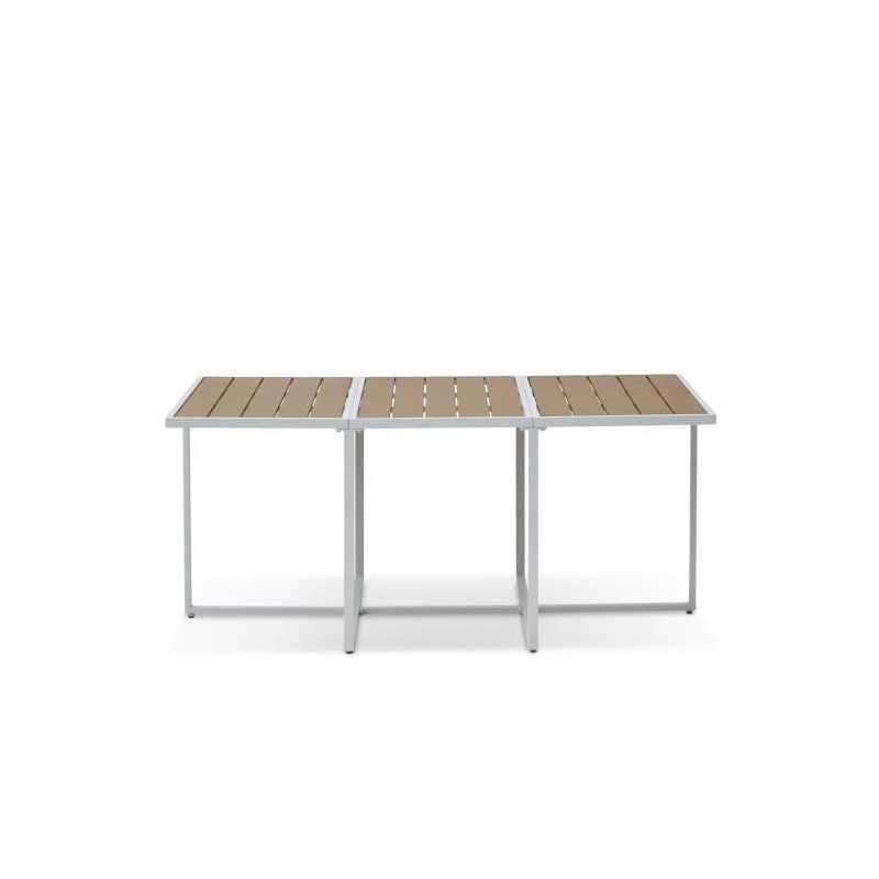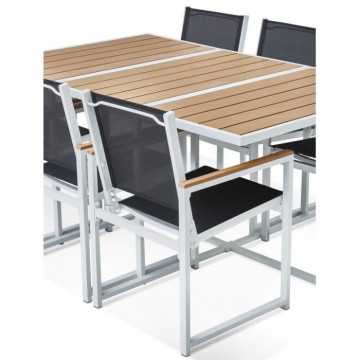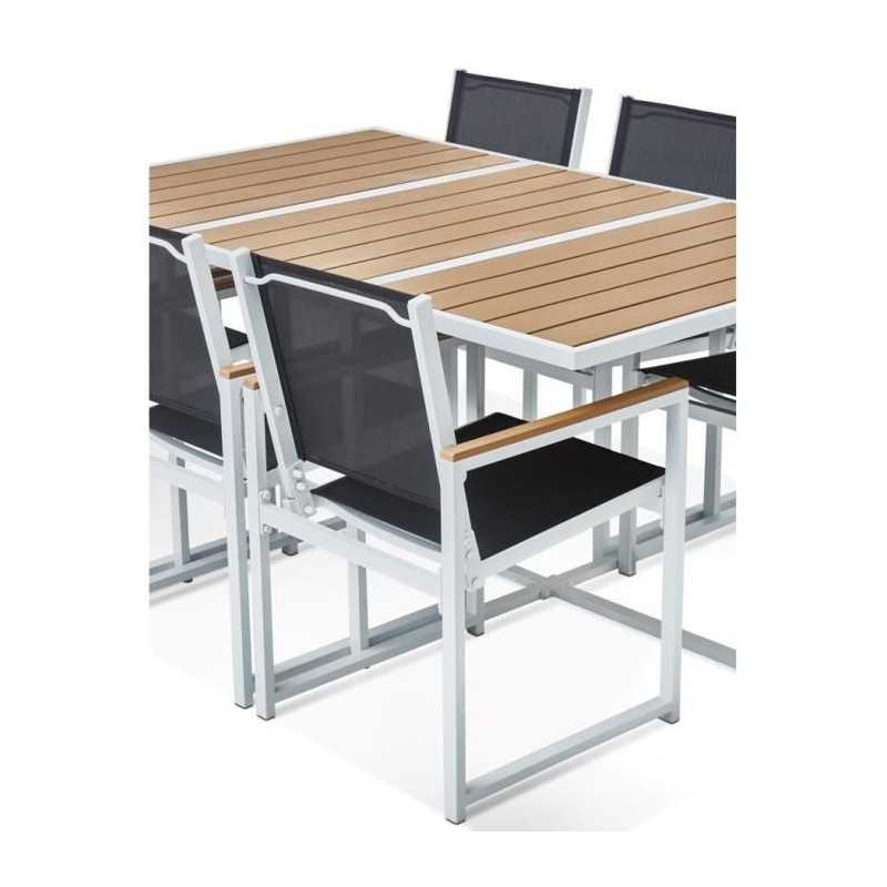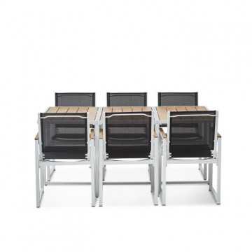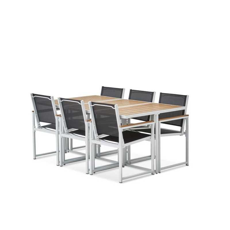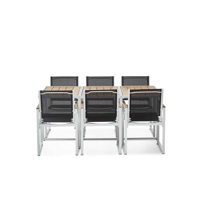 Notre ensemble repas CUBO 6 places propose une nouvelle approche du salon de jardin, de la convivialité en associant la legereté de l'aluminium, le textilene et un plateau résine pour proposer un design simple et pratique. Des chaises et une table qui prennent un minimum de place, se nettoient facilement et durent dans le temps avec un minimum d'entretien. Un must have pour votre terrasse.