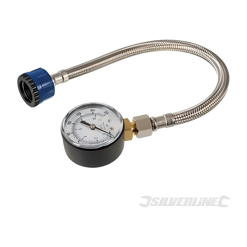 Tuyau tressé en acier inoxydable de 300 mm et manometre résistant a la corrosion. Alésage 9 mm et raccord 3/4". Dispositif servant a mesurer précisément la pression de l'eau des conduites. Permet de repérer et d'identifier d'éventuels problemes de plomberie. Compatible avec la plupart des robinets et installations dome