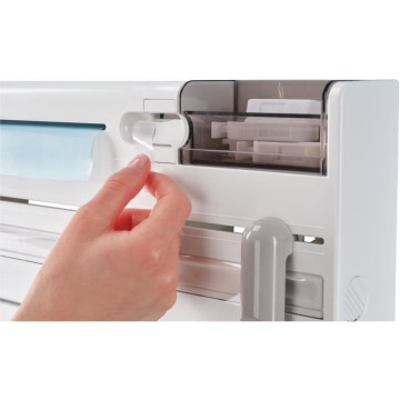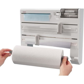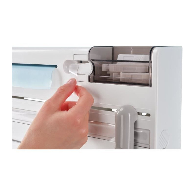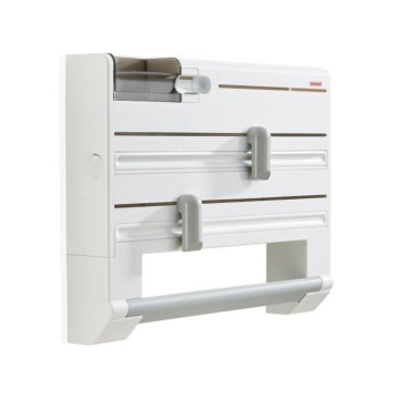 Dérouleur 3 rouleaux PARAT PLUS. Blanc. Avec un compartiment pour les petites pieces. Distributeur de sachets a congélation et de scotch. 2 curseurs inox. Vis et chevilles fournies. Garantie 3 ans