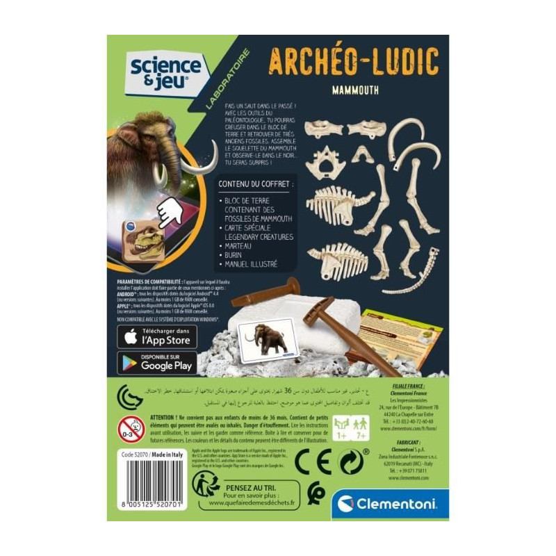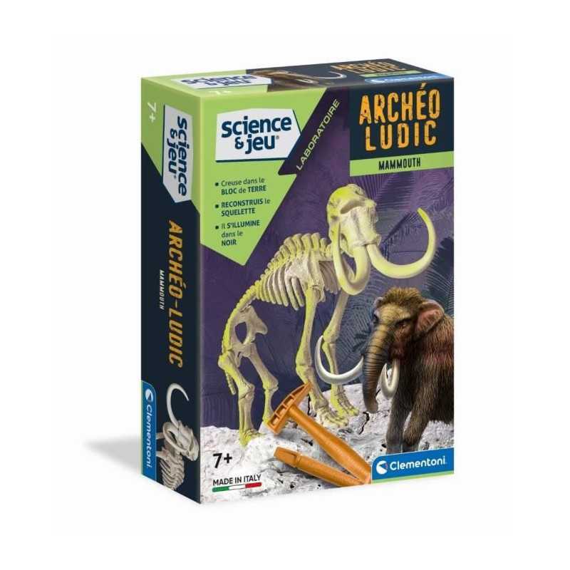 Ce coffret permet aux enfants de voyager dans le passé. Grâce a un burin et a un marteau, les enfants pourront creuser dans un bloc de terrain, y découvrir des restes "fossilisés" du Mammouth pour ensuite assembler son squelette - Mixte - A partir de 7 ans - Livré a l'unité