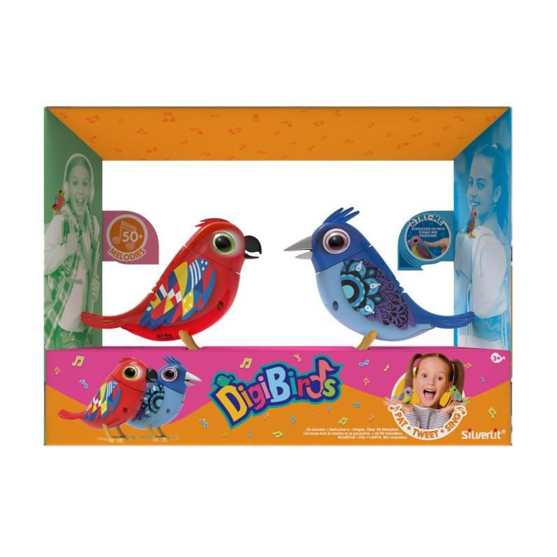 Les oiseaux DIGIBIRDS sifflent et chantent comme si c'étaient des vrais ! Ils réagissent aux caresses, a la voix et bougent la tete et le bec de façon réaliste. Ils se synchronisent aux autres oiseaux de la collection et peuvent chanter en coeur. Ils connaissent plus de 60 mélodies. a partir de 3 ans.