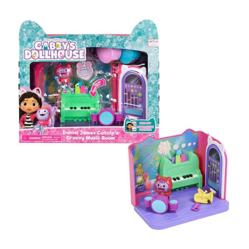 Retrouvez une des pieces de l'univers Gabby et la Maison Magique avec 1 figurine de chat et ses accessoires. Viens te déhancher avec Catnip ! Coffret comprenant : une piece, une figurine de chat, 3 meubles, 2 boîtes surprises et 3 accessoires. La piece se connecte a la Maison Magique de Gabby (vendue séparément). Une application gratuite a télécharger grâce au QR code inclus pour continuer a jouer !