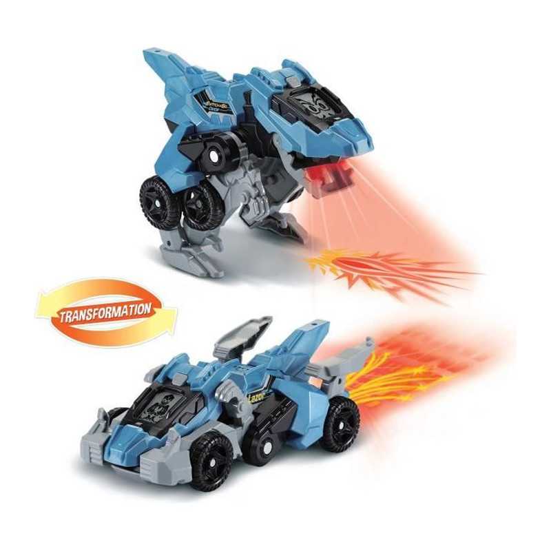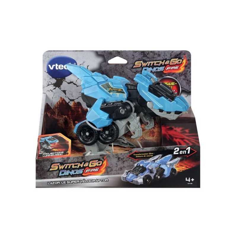 Switch & Go Dinos Fire - Lazor, le super vélociraptor - Se transforme en un clin d'oeil en une voiture de course super rapide - Une projection de couleurs apparaît quand on appuie sur Lazor - Écran LCD avec animations - Plus de 30 phrases et effets sonores réalistes - Fonctionne avec 2 piles LR6/AA fournies - 4 ans +