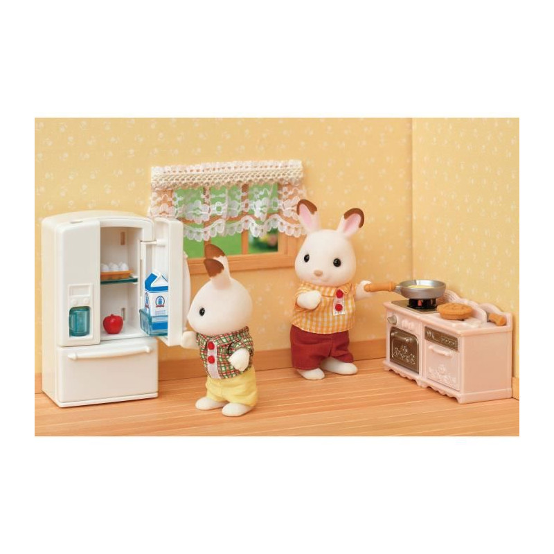 Un set d'ameublement pour les maisons des Sylvanian Families, avec une figurine maman lapin chocolat. Contient de nombreux meubles et accessoires. Tournez le bouton de la gaziniere pour allumer les flammes. Placez la tarte aux pommes ou la baguette sur la table de découpe et coupez-les a l'aide du couteau.