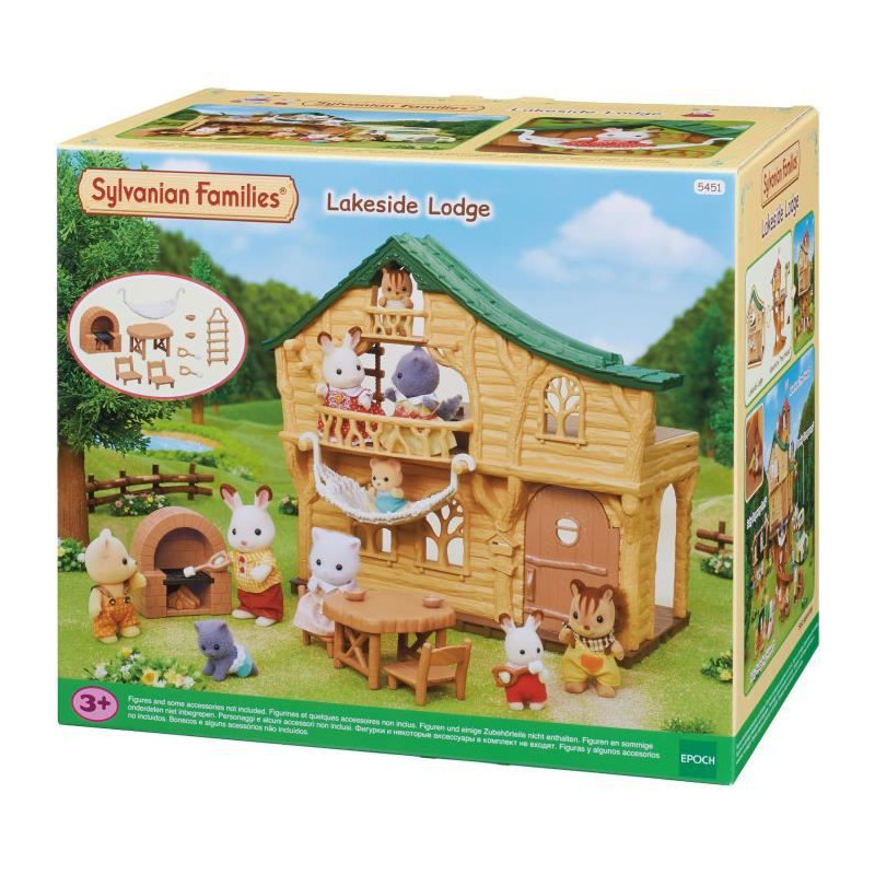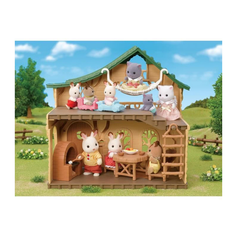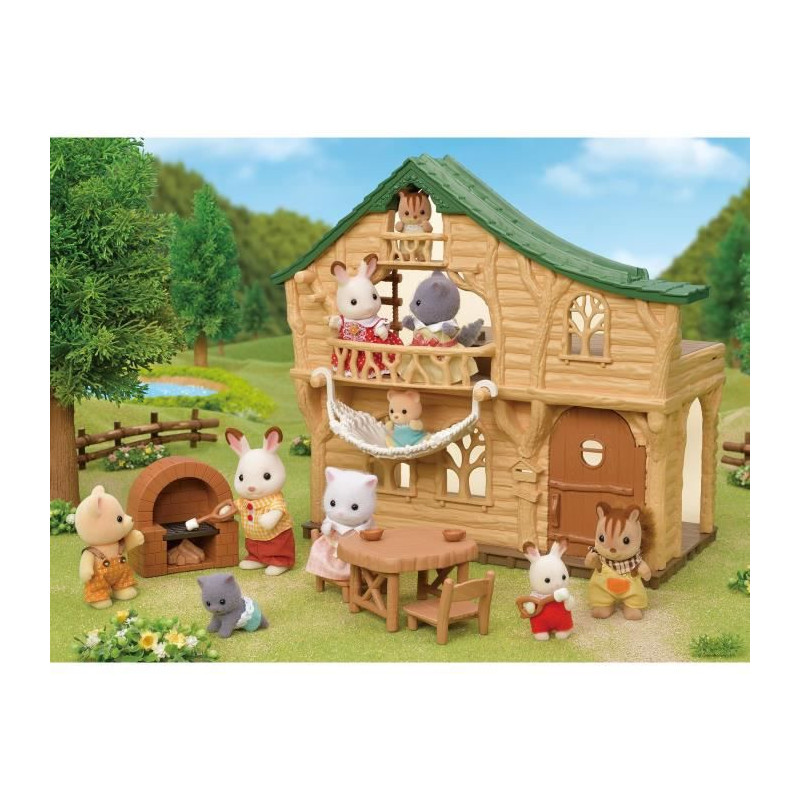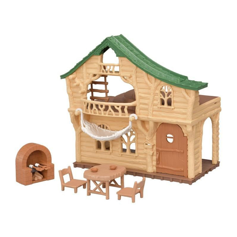 Le chalet du lac est composé de 2 pieces principales reliées par une échelle et d'un balcon. Il possede des meubles et des accessoires : un poele a bois devant lequel les Sylvanian Families cuisinent, une table a manger sur laquelle ils partagent les repas et un hamac pour se reposer.