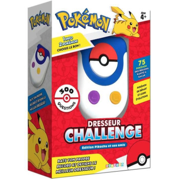 Devenez incollable sur l'univers des Pokémon grâce au quizz Dresseur Challenge : édition Pikachu et ses amis. Un jeu interactif permettant aux joueurs de tester leurs connaissances sur 75 Pokémon et leurs évolutions issus des régions Kanto a Galar. 300 questions vous attendent pour devenir le meilleur dresseur Pokémon ! Un principe de jeu simple et fun