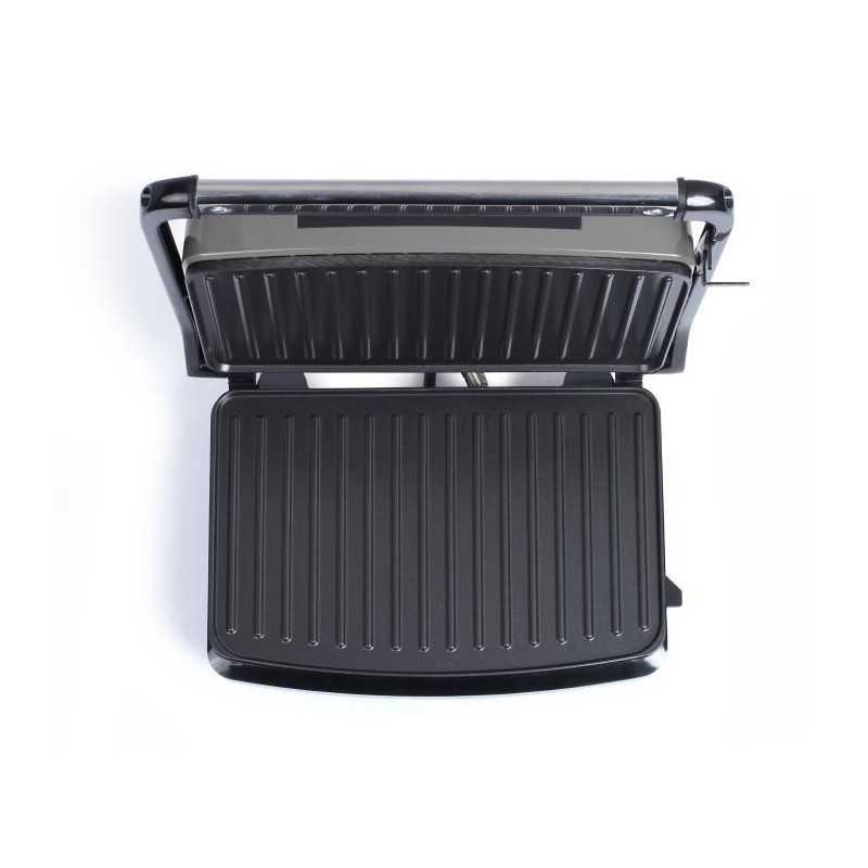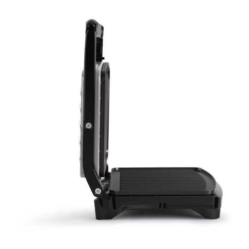 Compact grill - Plaques rainurées avec revetement antiadhésif - Charniere ajustable pour s'adapter a l'épaisseur des aliments - Surface de cuisson de 23 x 15 cm- Témoin lumineux de chauffe - Ajustement automatique de la température - Rangement vertical possible- Crochet de verrouillage et pieds antidérapants
